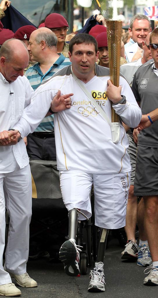 The soldier, who is considered the most seriously-wounded soldier to survive the war in Afghanistan, was mobbed as he turned up for his 300m leg with the flame near the town centre.