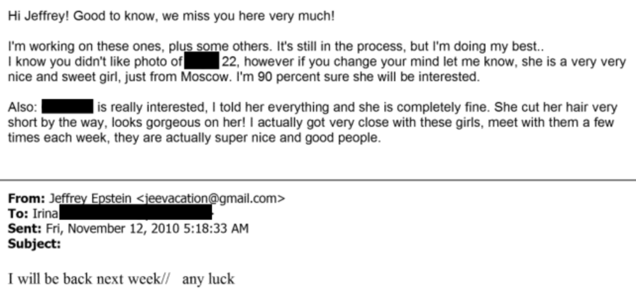 A few days later, on 12 November, Epstein emails Irina again, indicating that he has secured a Russian visa. He tells her “I will be back next week” and asks “any luck”.
