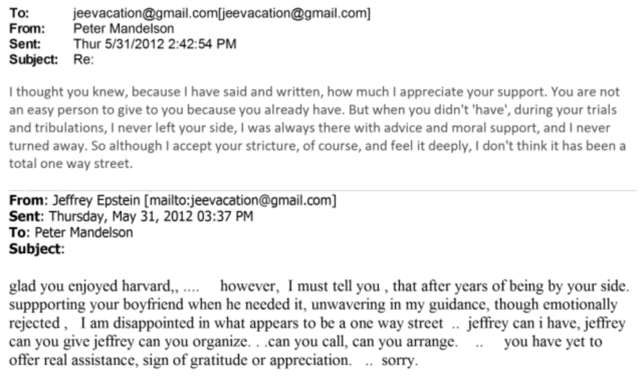 In 2012, it appears the relationship between Lord Mandelson and Epstein took a sour turn. Epstein sends an email to Lord Mandelson on 31 May, telling him: “after years of being by your side. supporting your boyfriend when he needed it, unwavering in my guidance ... I am disappointed in what appears to be a one way street”.