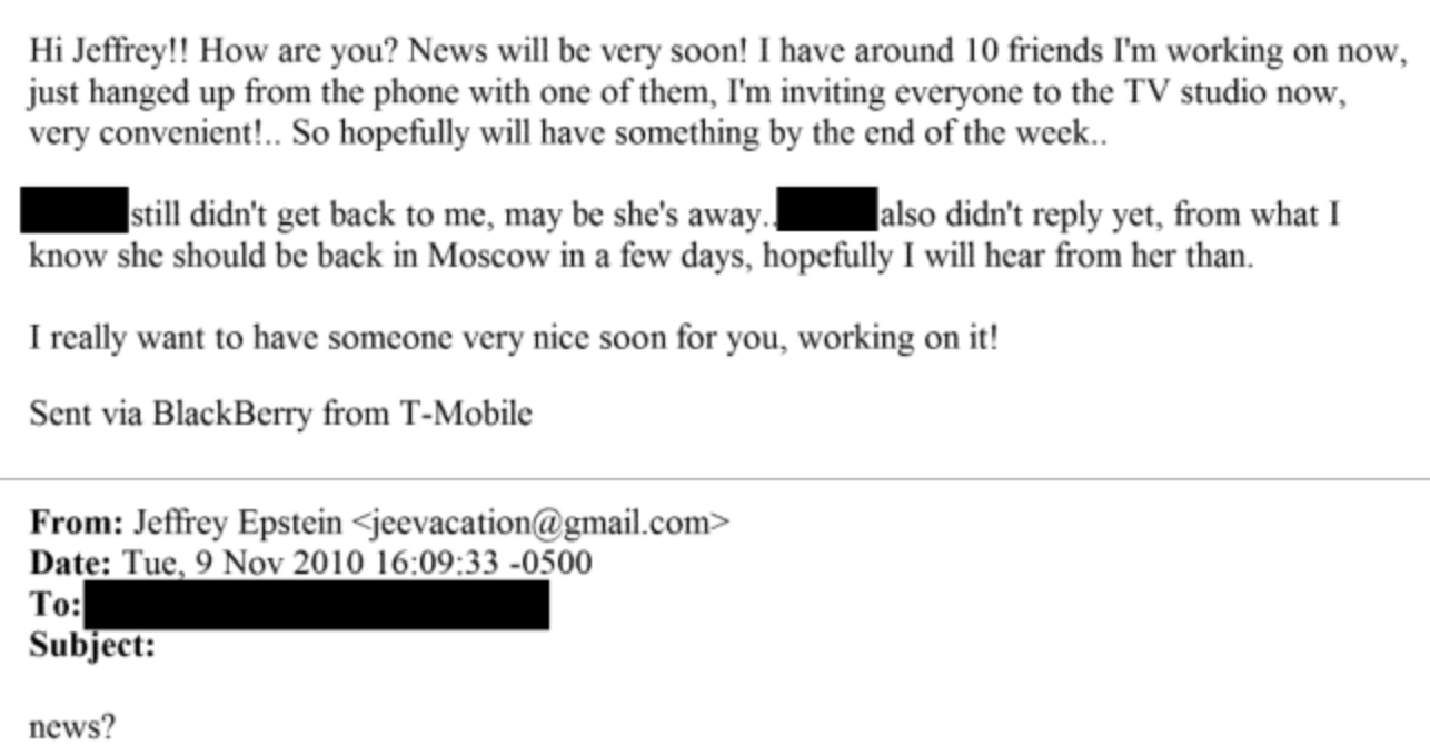 The same day, Epstein emailed a recipient identified only as ‘Irinia’ asking “news?”, to which she replies: “I have around 10 friends I’m working on now” and “I really want to have someone very nice soon for you”.