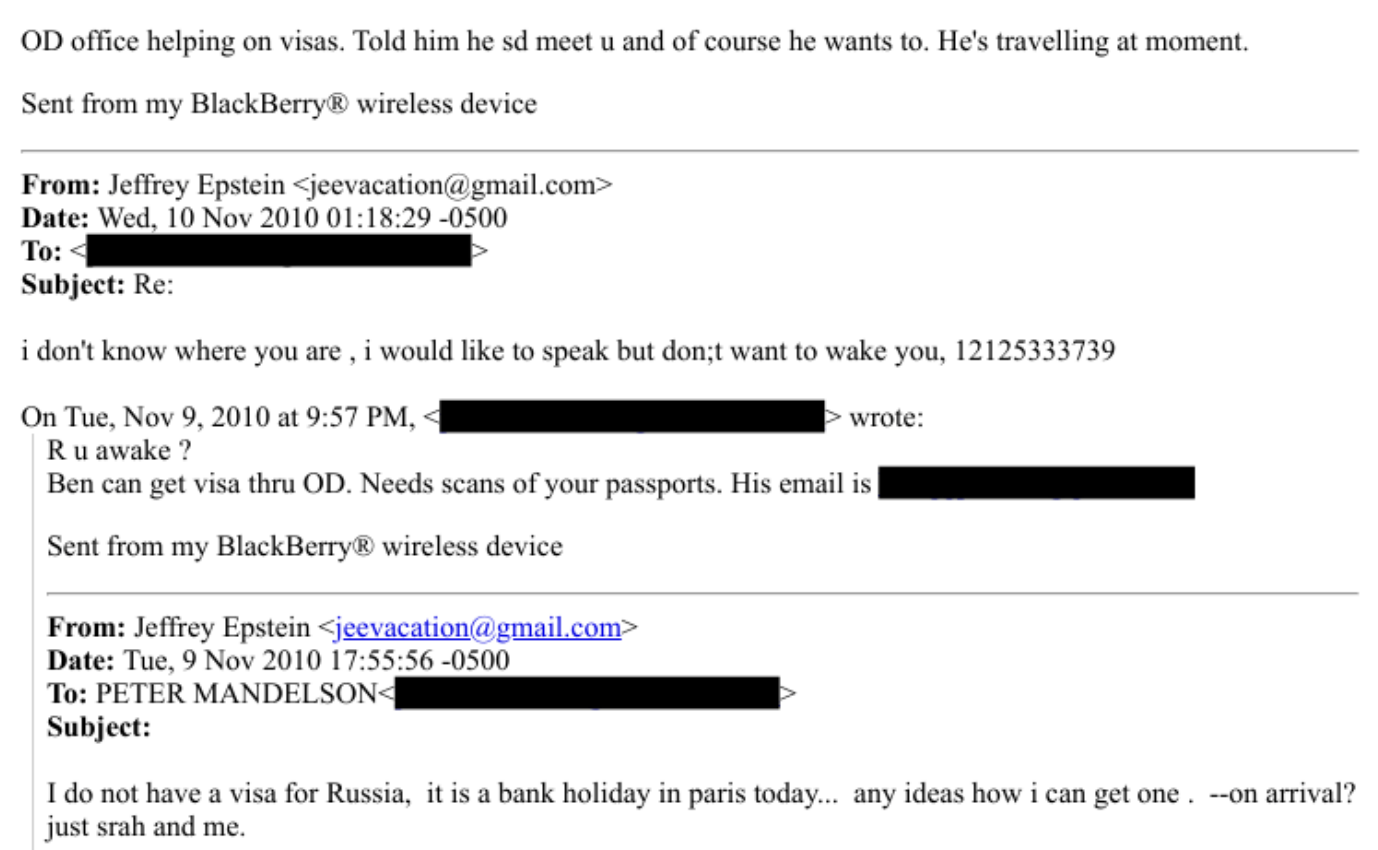 The files show that, on 9 November 2010, Epstein e-mailed Lord Mandelson to tell him that he needs a visa for a trip to Russia, asking if the former minister has “any ideas how i can get one?”