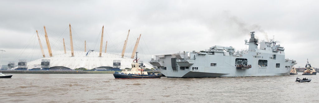The Royal Navy's largest ship made its way up the River Thames today as part of a security exercise ahead of the Olympics in London.