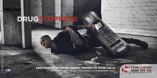 Banner shows a hand-cuffed black man pinned to the ground by a giant mobile phone next to the slogan ‘Drugstoppers’