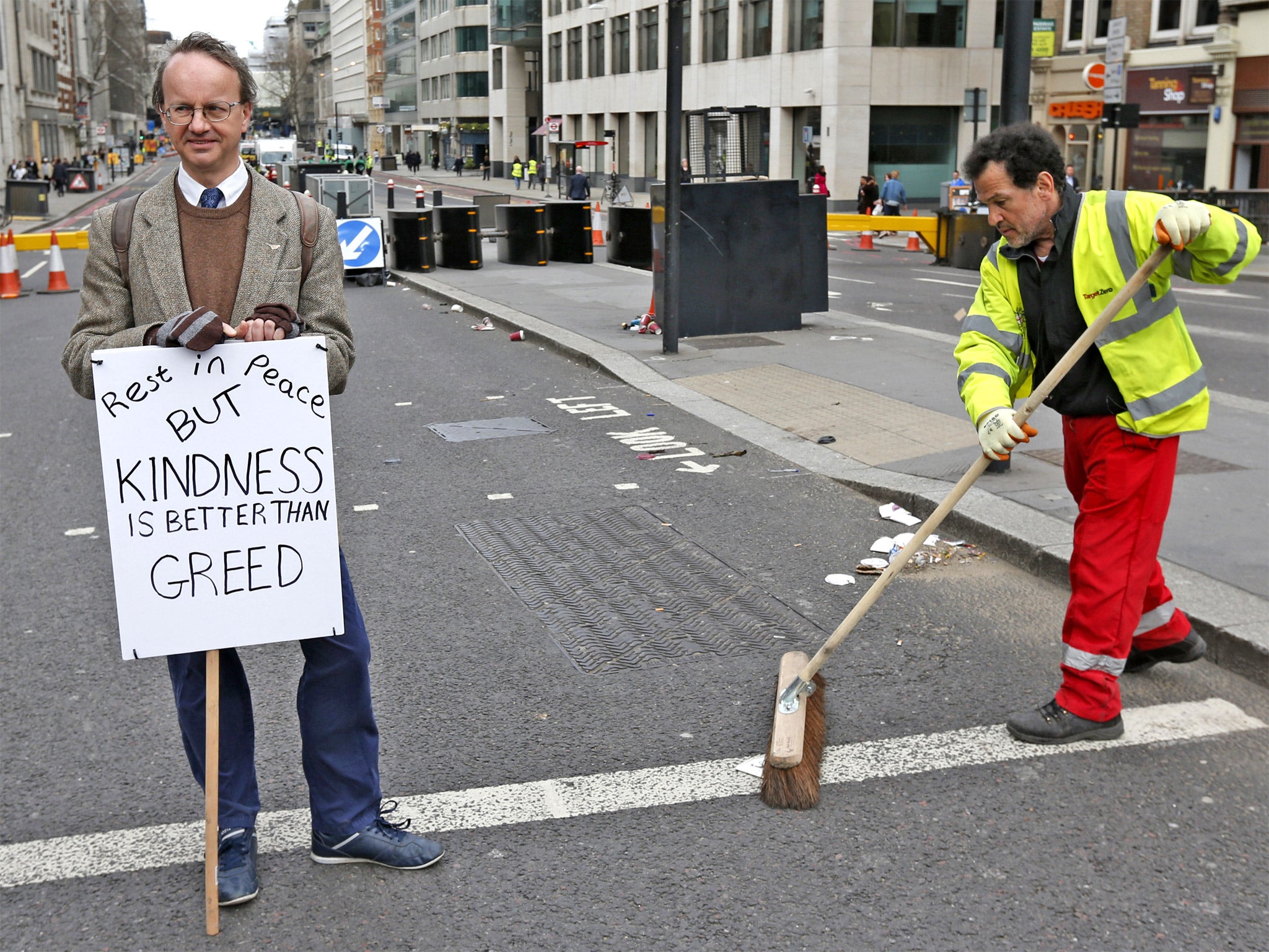 It was at Ludgate Circus and outside St Paul’s itself where the largest and most vocal collection of protesters gathered. Throughout the morning those opposed to the funeral had made their feelings known with shouts of “Waste of money!” and “End Thatcherism!” whenever police or the military walked past.