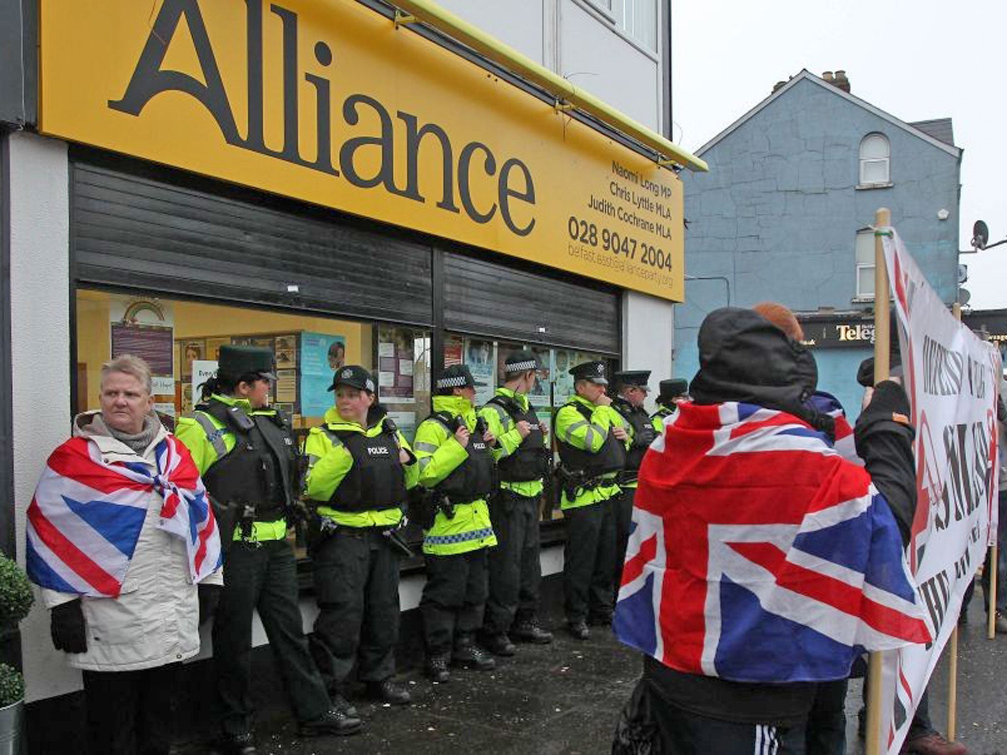 Outside the office a dozen of those constituents, including two middle-aged women wearing union flags as cloaks, maintain a a vigil in the cold, watched by the police in the Land Rover. They complain vociferously that during protests "the cops beat us into the ground."