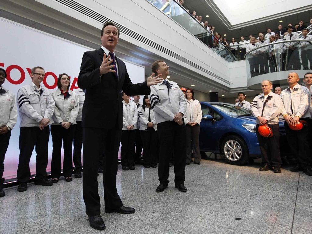 On Thursday he was in Derbyshire to announce a "massive vote of confidence for UK manufacturing" with 1,500 new jobs at Toyota. That same day he visited Nestlé to announce "brilliant news" after 300 jobs were created. The next day saw a trip to Lotus in Oxford to hail the British Formula One industry as a world leader in engineering.