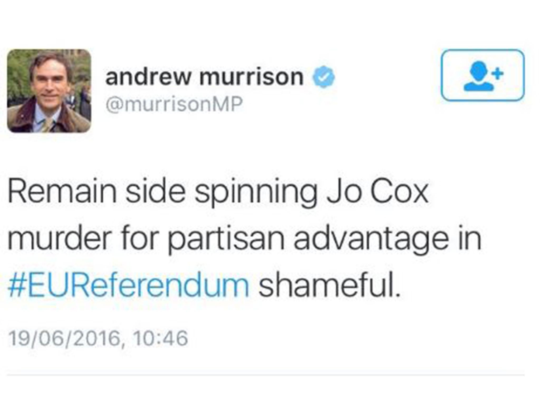 Andrew Murrison, a backbencher, tweeted: “Remain side spinning Jo Cox murder for partisan advantage in #EUReferendum shameful.” He has since deleted the tweet.