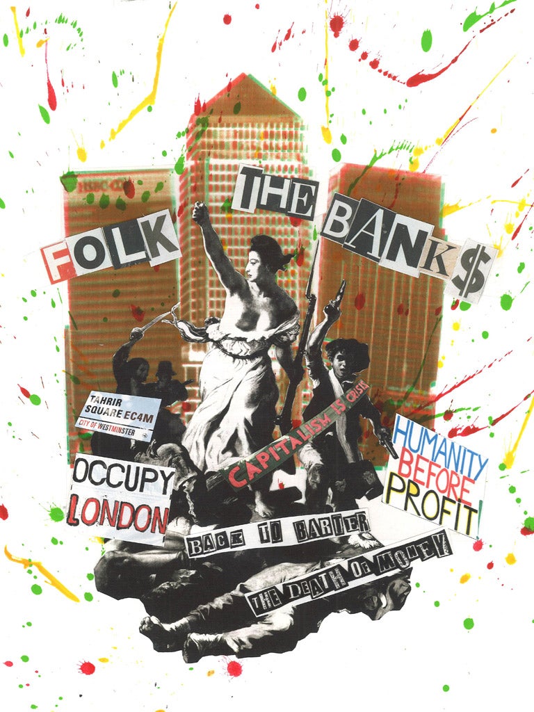 Reid's art is most famously associated with the Pistols. Now, the self-defined "Socialist with anarchist tendencies" has designed the cover of Folk the Banks, a benefit album launched by Occupation Records in the UK to fund the protest movement that has spread across the world.