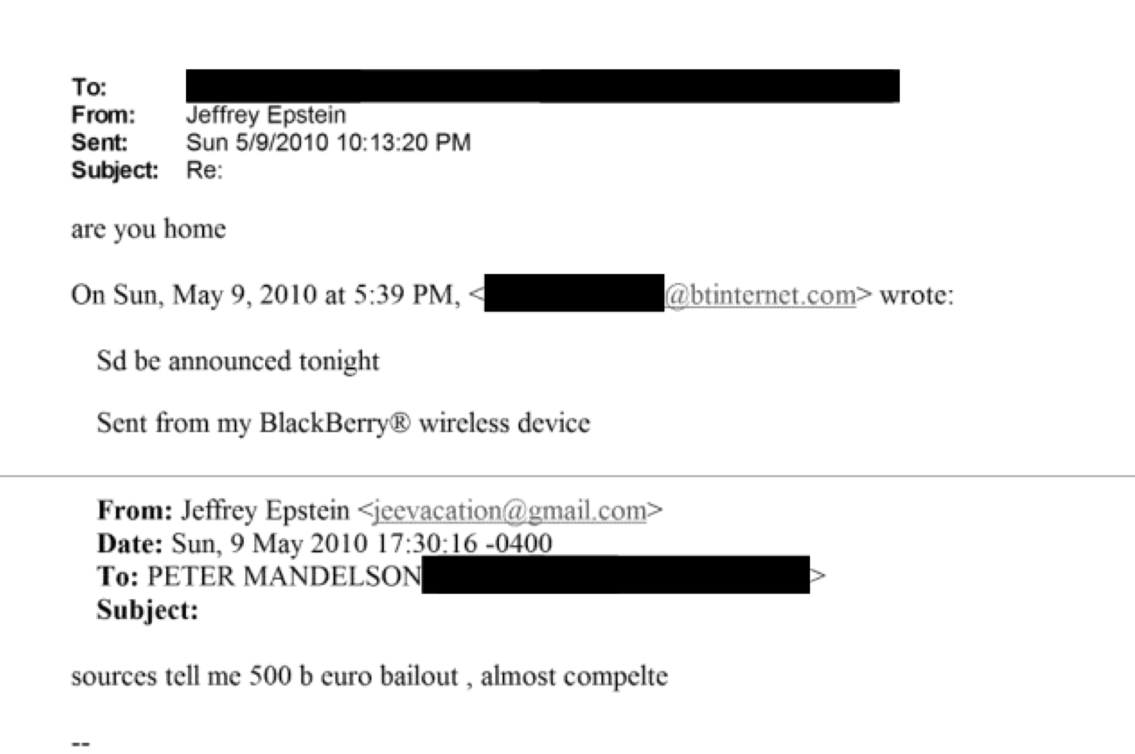 Lord Mandelson appeared to give Jeffrey Epstein advance notice of a €500bn bailout to save the Euro.