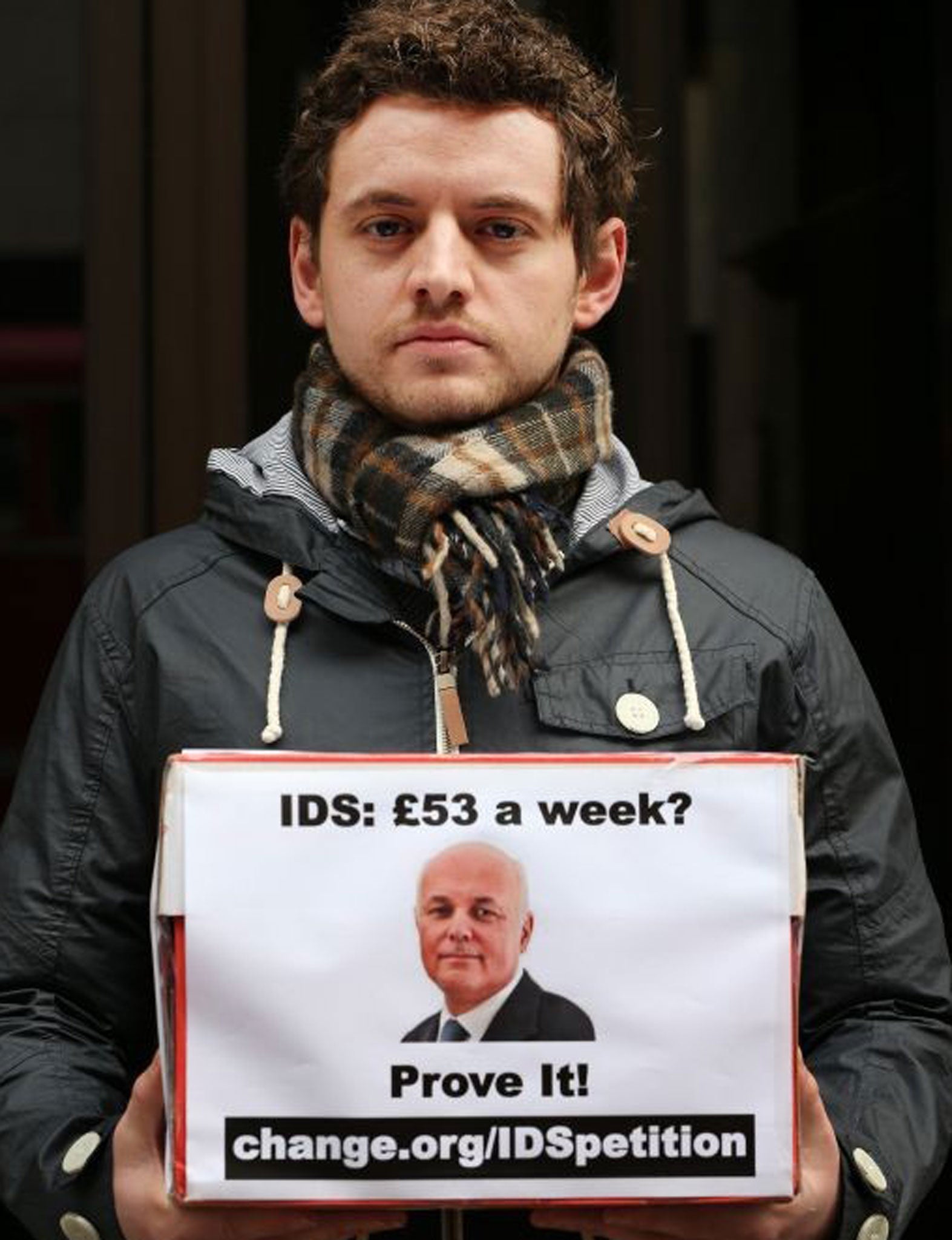 Prove it! Campaigners deliver petition calling for Iain Duncan Smith to live on £53 a week to his Whitehall office