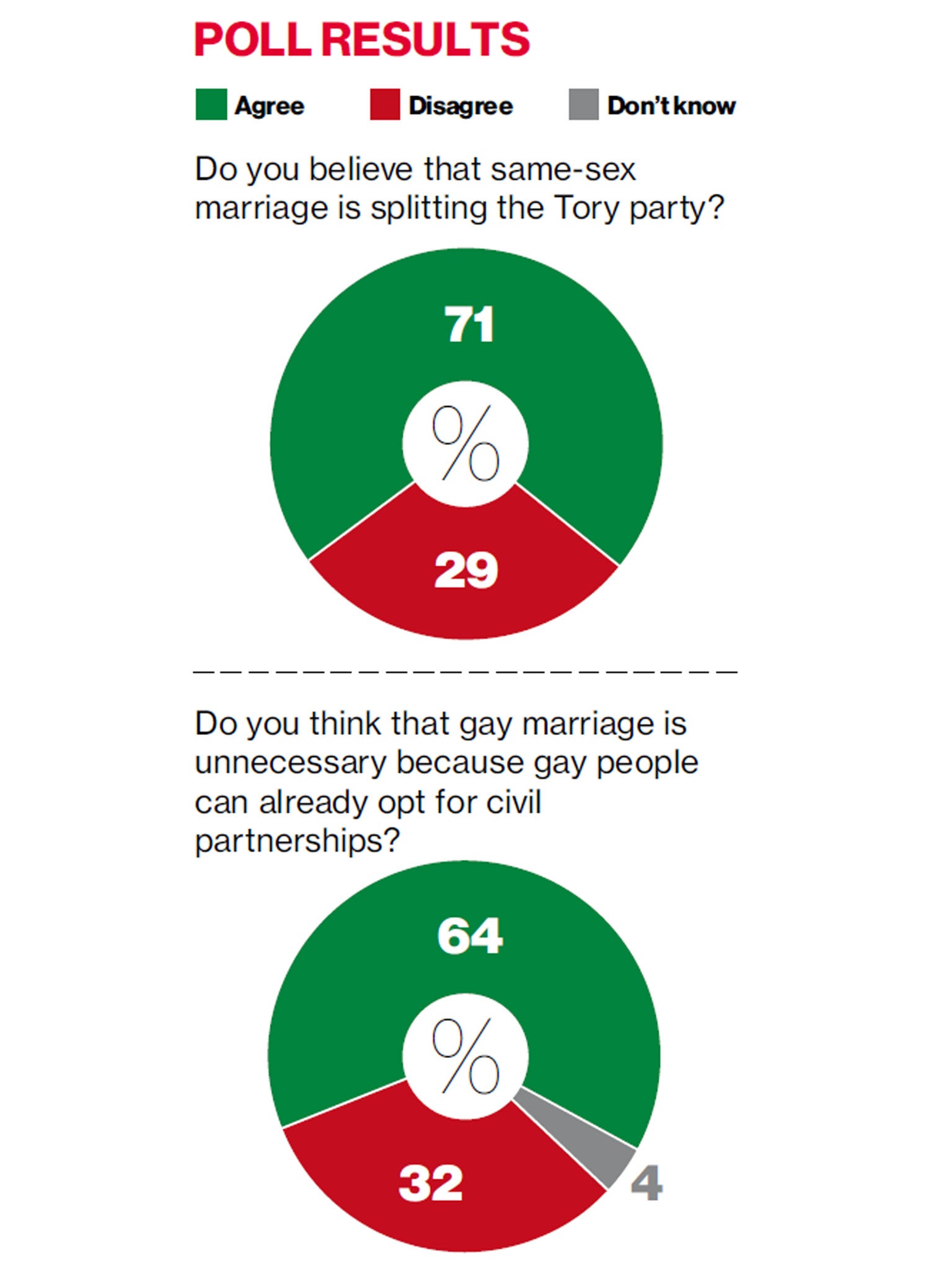 A majority of Tory members (64 per cent) think gay marriage is unnecessary because gay people can already opt for civil partnerships, while 32 per cent disagree. Almost six out of 10 (58 per cent) believe that marriage "should remain between one man and one woman", while 34 per cent disagree.