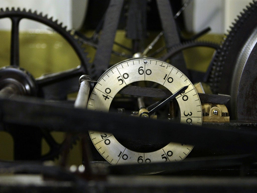 He checks his watch – 11pm, time to start the going train. The ticking is produced by the double three-legged gravity escapement, a revolutionary device designed by Edmund Beckett Denison, which keeps the clock accurate by compensating for outside pressure. They all pull on ear defenders. White has a pair done in faux leopard skin. Westworth presses a button near the doorway; the engine sputters to life; winding the bobbins begins. The same happens every Monday, Wednesday and Friday. However, the going train is still hand-wound. Robeson grips a handle in its centre and rotates it. After 30 turns, Westworth takes over. Next, it's White, then Smith.