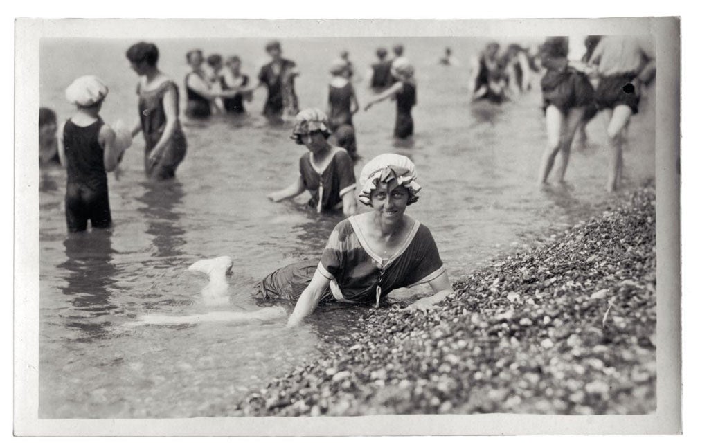 Swimming at Tenby, despite the town's exceptionally clean and inviting water, I am usually the only one in. I reflect on my collection of postcards from the early decades of the 20th century that show large groups of workmates, friends and neighbours bathing at Margate, at Westward Ho! and Cleethorpes, huddled together in their hired costumes, grinning back at the camera, having fun in the water. Nowadays, it is rare to see groups of swimmers such as these other than at organised events such as charity swims or triathlons, which tend to be serious and grimly competitive affairs. I seldom see families swimming together. More commonly, wet-suited children play in the shallows with a bare-footed adult keeping watch at the water's edge, arms folded and trousers rolled above the knee.