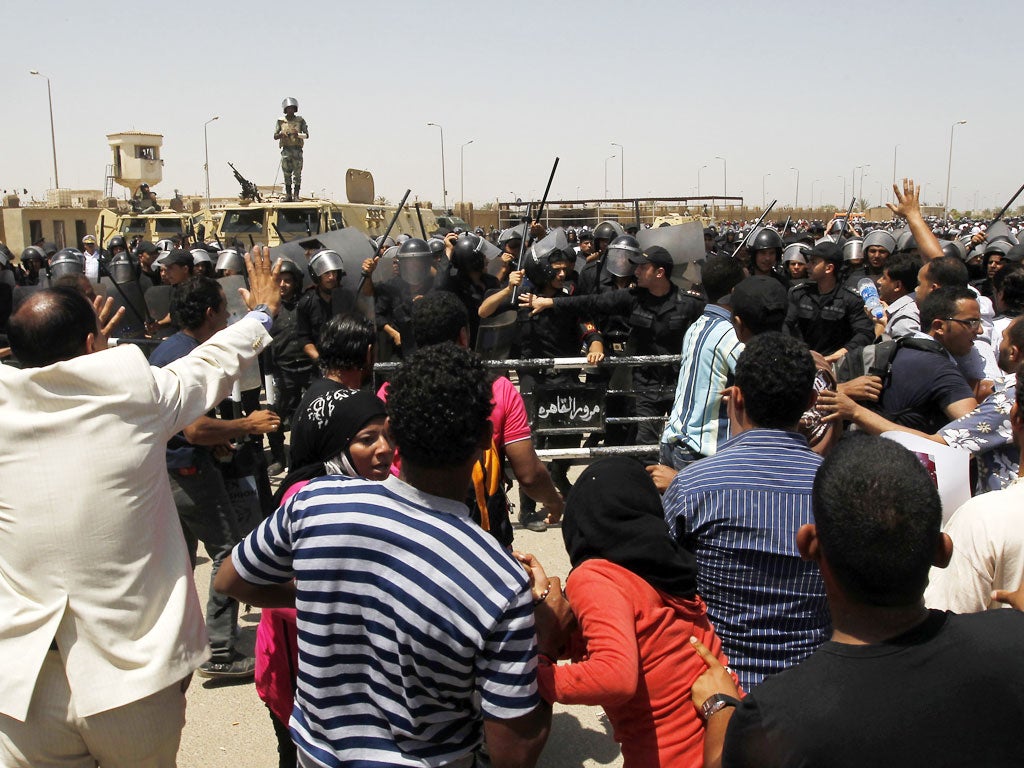 But that scene soon descended into tensions and scuffles, as thousands of riot police in helmets and shields held the restive, mostly anti-Mubarak crowd back behind a cordon protecting the court.