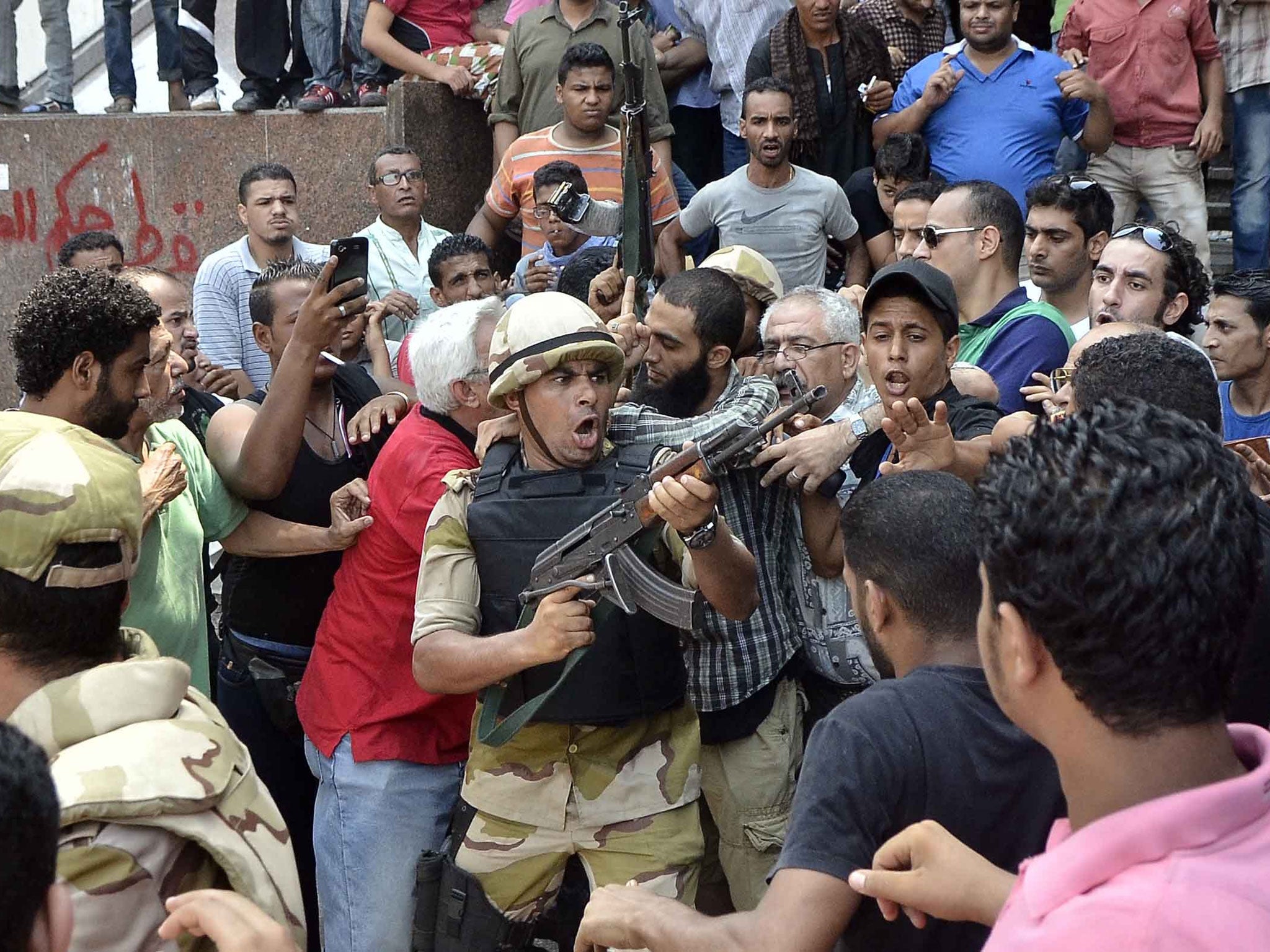 Hundreds of locals were crammed against the pointed steel gates of the mosque courtyard. Many were in no mood to forgive those trapped inside; in the minds of some Egyptians, the Morsi supporters have become little more than "terrorist" outlaws.