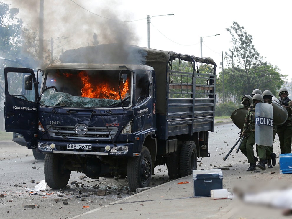 Police fired tear gas at the convoy and used water cannon as they tried to stop it reaching the capital's main business district, live footage on Kenyan TV showed. Some protesters threw stones at police. TV footage showed two vehicles on fire.