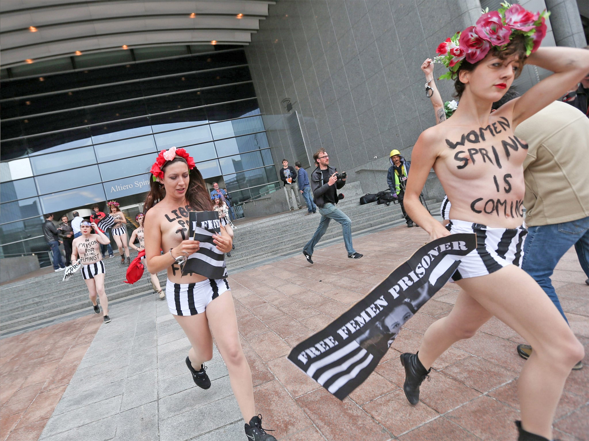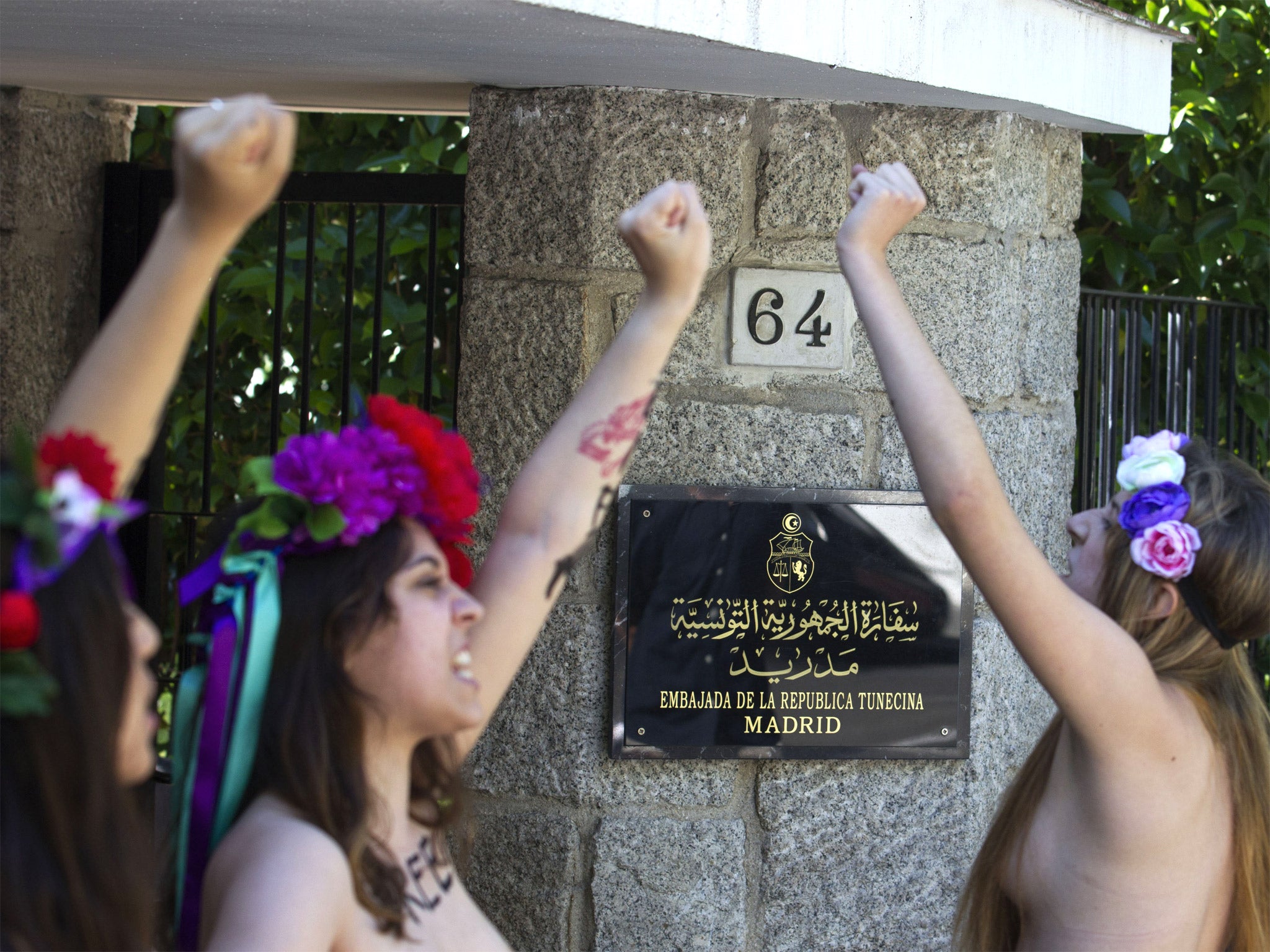 The women first appeared in court last Wednesday when two French lawyers also flew in to assist with the case. However the trial was adjourned and the women were denied bail. The French lawyers did not return for the hearing today but said last week that they would fly back immediately if the women were not released. The case has also been attracting international attention with three other members of Femen protesting topless today outside the Tunisian Embassy in Madrid in defence of the three women.