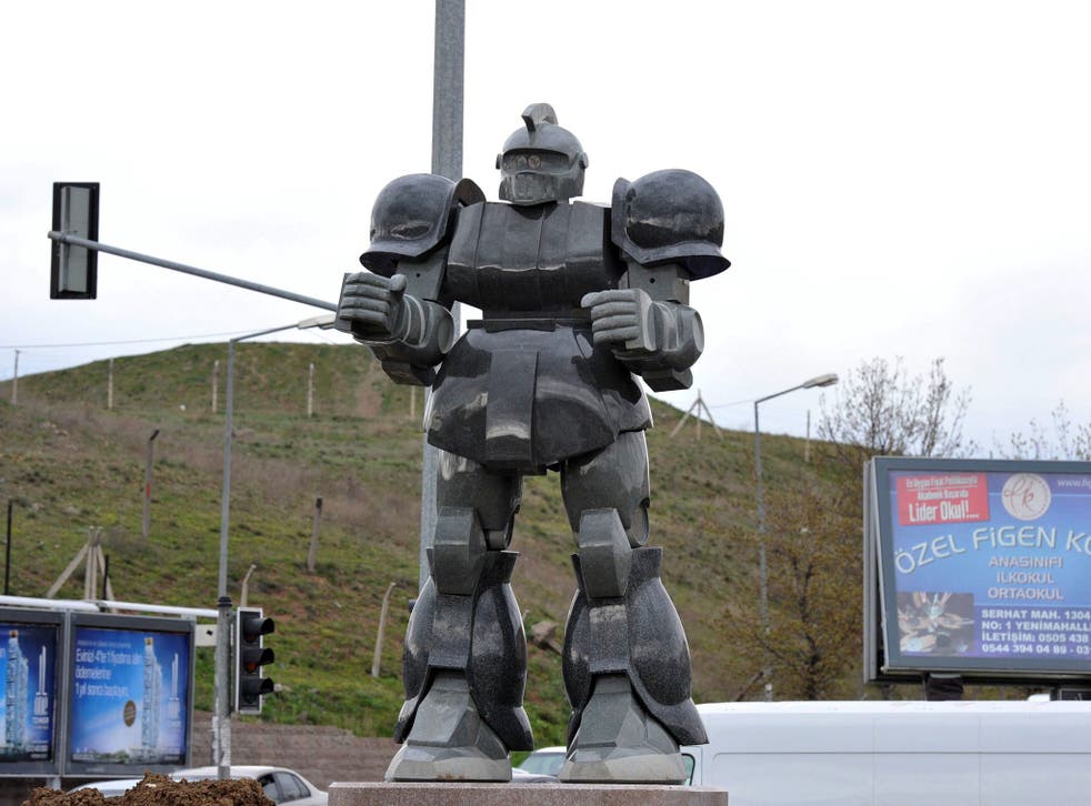 The statue, which resembles a Transformer but cannot be named as such due to copyright issues, was erected at a crossroads to promote the city's new themepark, which has been described as a "prestige project" by the mayor.