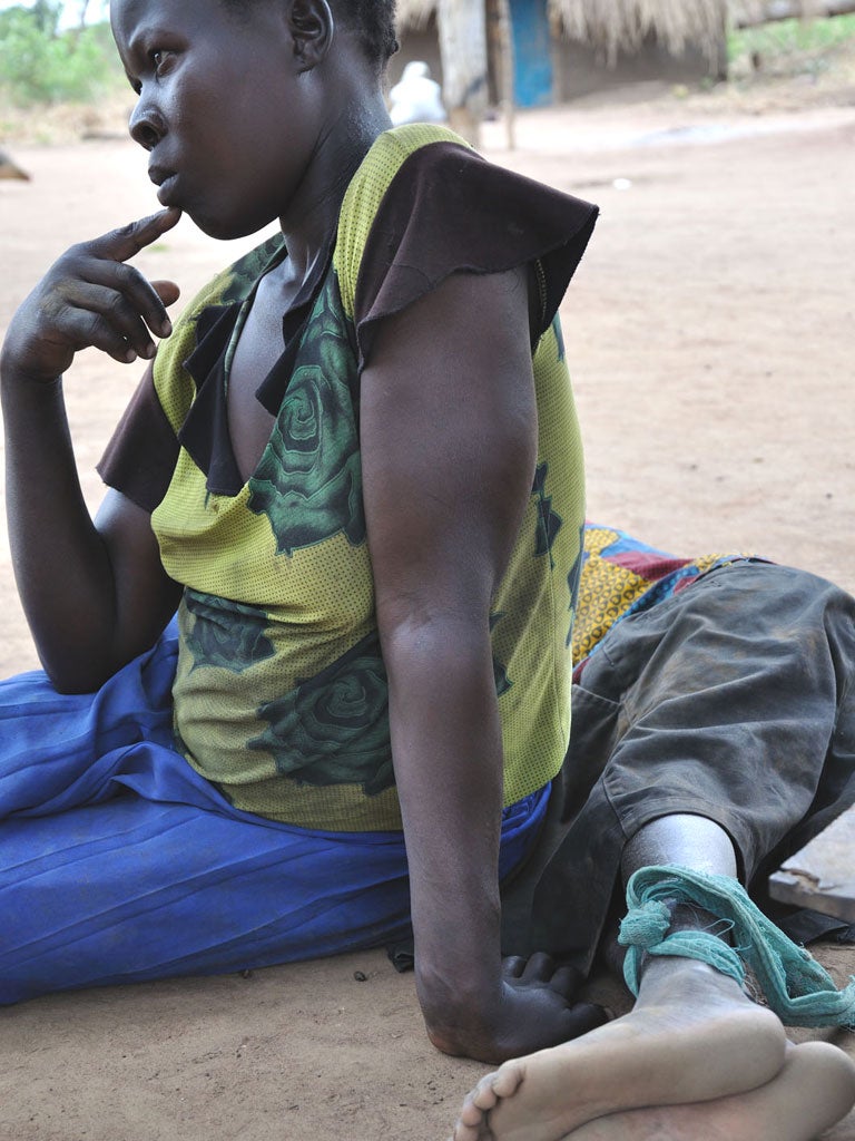 On a sunny day in Lapul village in Pader district, northern Uganda, 13-year-old Nancy Lamwaka lies on the dirt, her ankles shackled to the branch of a mango tree as her younger siblings play happily around her.