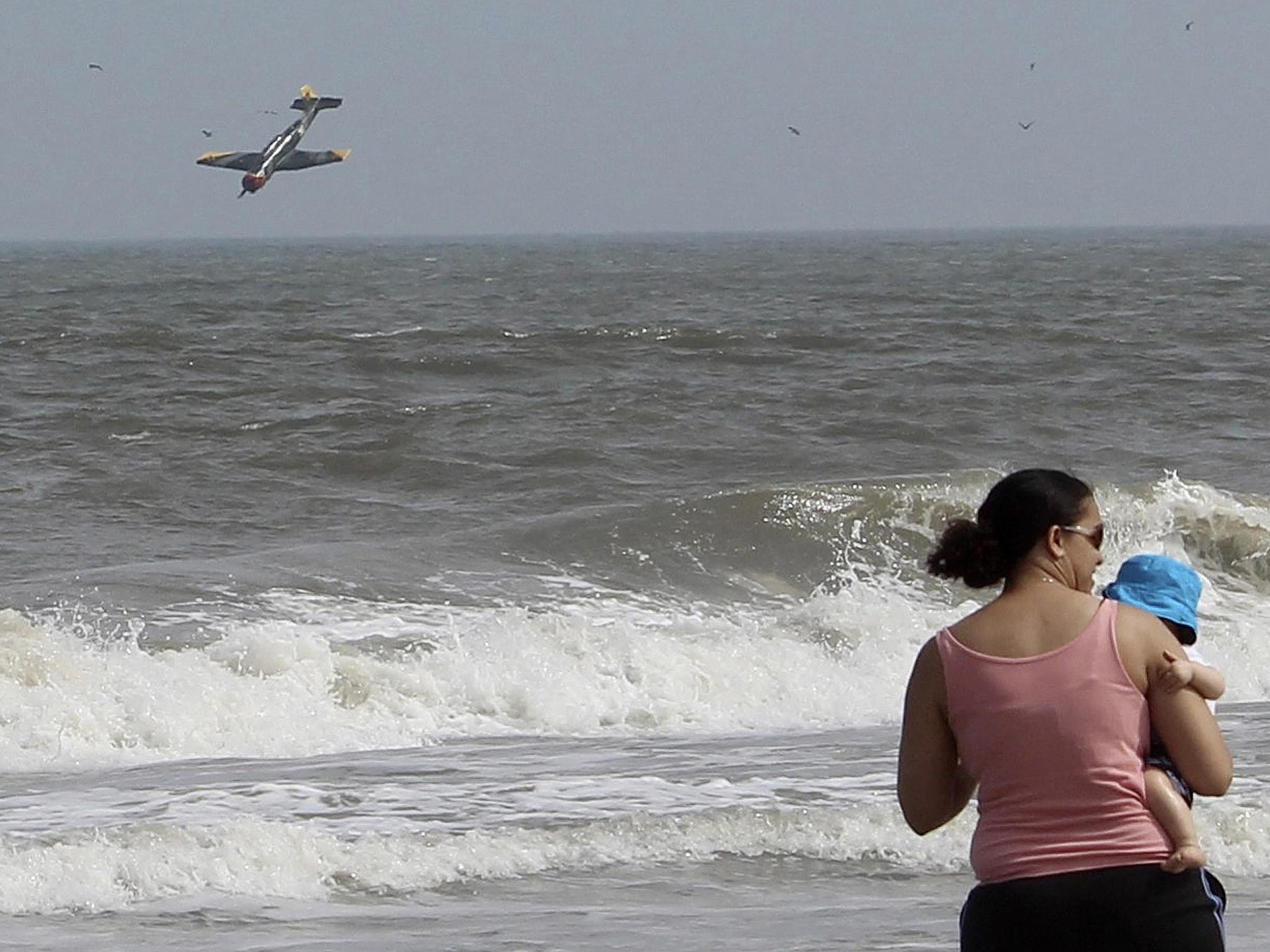 Photographs have captured the shocking moment a plane spiralled out of control and crashed into the sea.