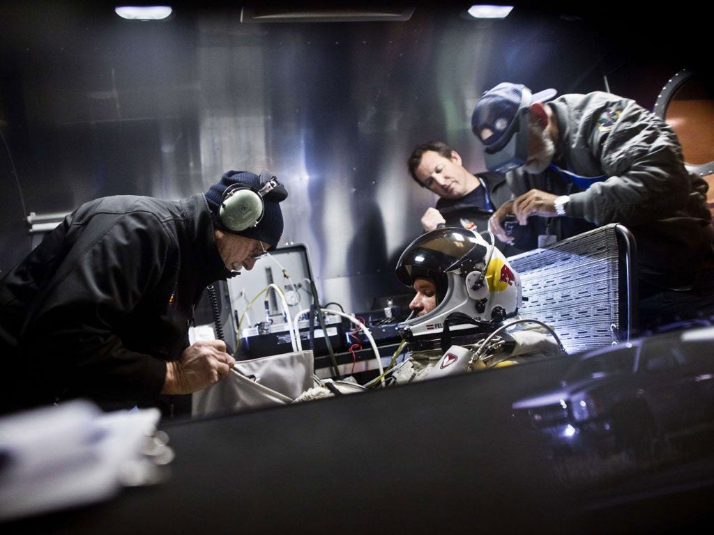 By the time Baumgartner stepped onto his tiny balcony to take in a view few men will see, hearts raced as fast as his. He stood and then he fell, quickly shrinking to the size of a pinprick.