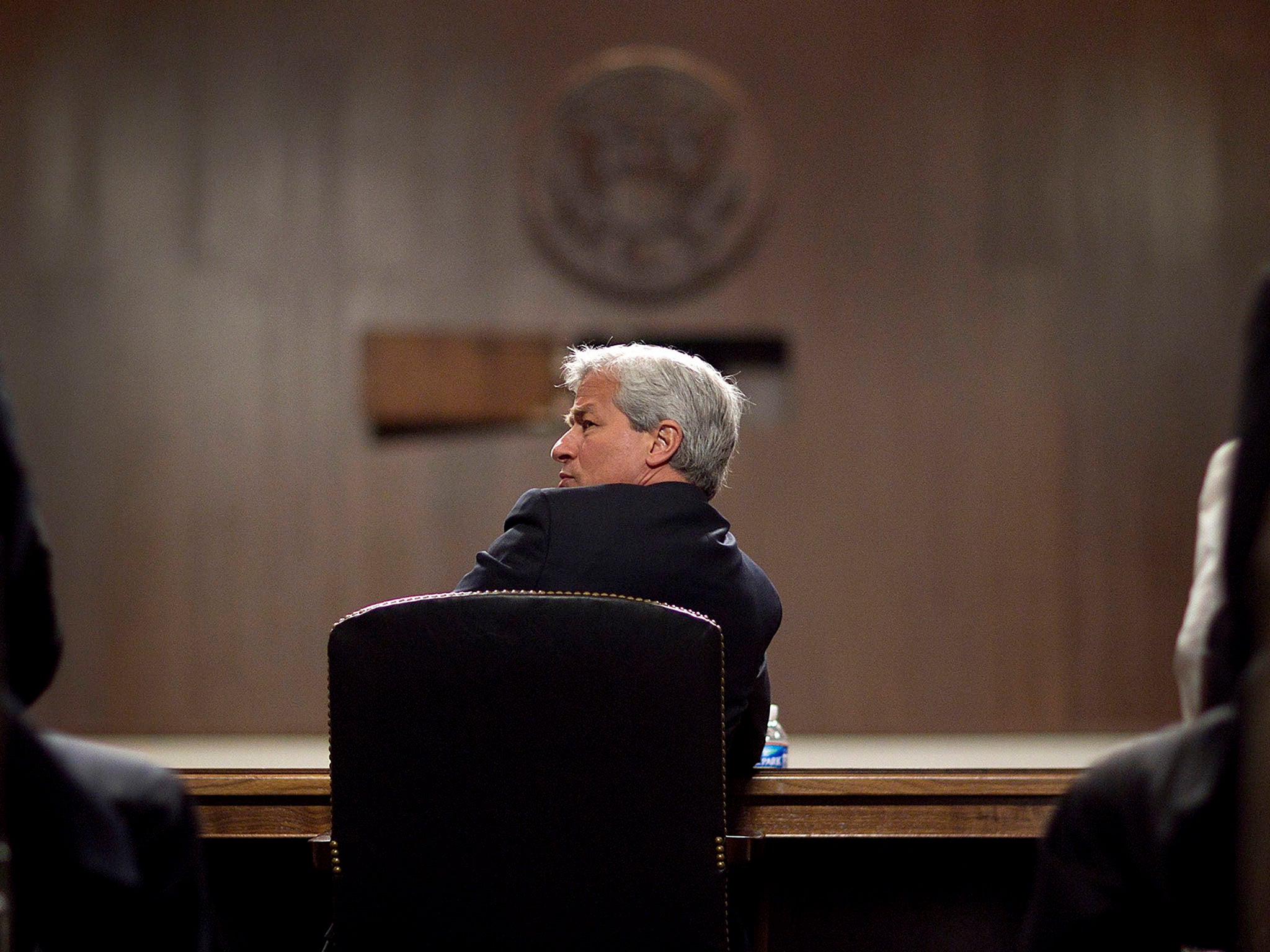 "You have to make the most of it and really try for unique perspectives. After getting several shots from the front and side of the witness table, I put on my shallow depth-of-field 85mm lens and went around to the back, behind Dimon's chair. I was composing my frame with the camera firmly on the ground and using the live-view function. As I was focusing on the back of Dimon's head, he turned to his assistant and in an instant I was able to capture the two-second moment, perfectly composed, in the hearing room."