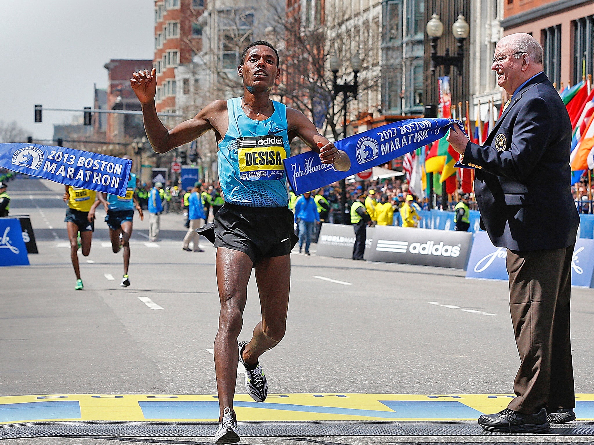 It is what the day should have been remembered for: two hours before the blasts, racing in only his second marathon, the 23-year-old Ethiopian Lelisa Desisa crossed the finishing line in first place, with a time of two hours, 10 minutes and 23 seconds. It had been an excellent morning for marathon running in Boston: clear and dry, warm but not hot. A few blocks away in Fenway Park, the Red Sox were about to beat the Tampa Bay Rays. Behind Mr Desisa were another 23,000 runners, and around them some half a million spectators. Among those watching, in the VIP stands close to the finishing line, were the families of those killed in the Newtown shootings in December.