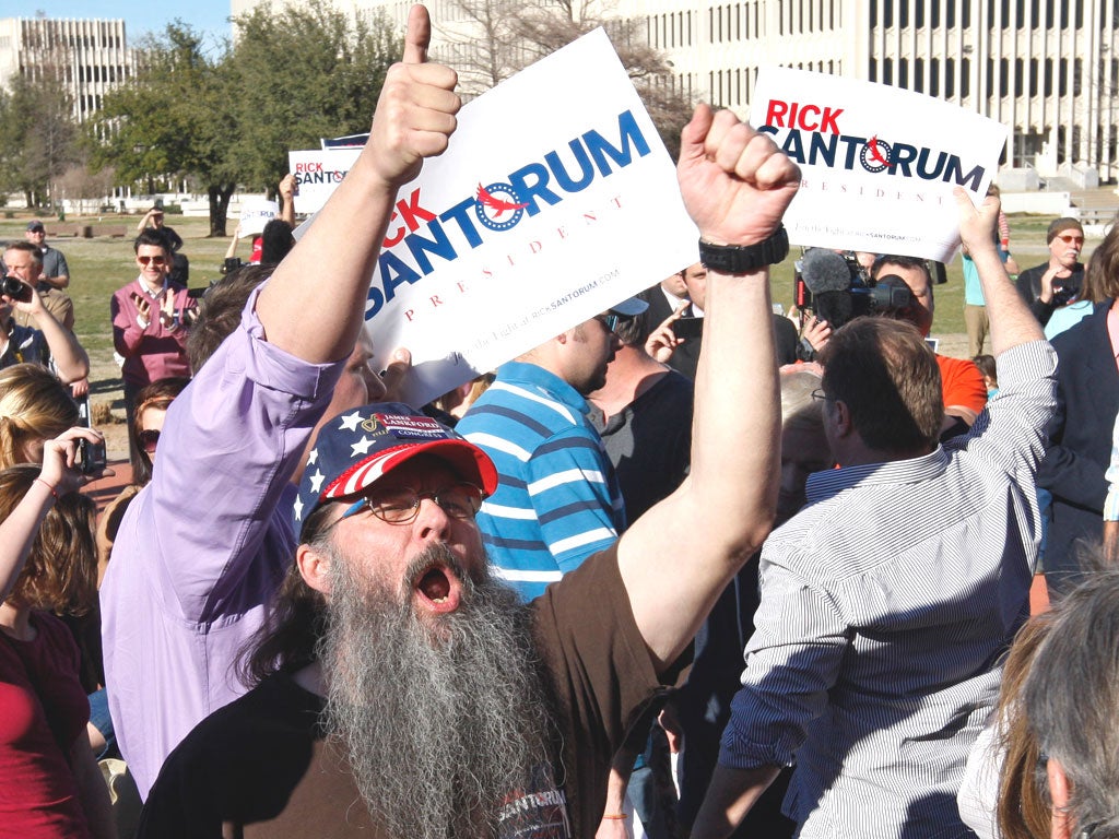 Aside from a small cabal of Occupy Wall Street protesters, the crowd lapped it up. As a staunch Roman Catholic, Santorum is a hero to evangelical voters who make up around 70 per cent of Republicans in Southern states. He currently boasts the support of more than 40 per cent of such voters, roughly twice the amount of any of his rivals.
