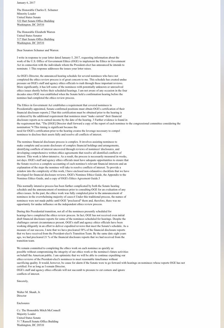“I am not aware of any occasion in the four decades since OGE was established when the senate held a confirmation hearing before the nominee had completed the ethics review process,” he wrote.