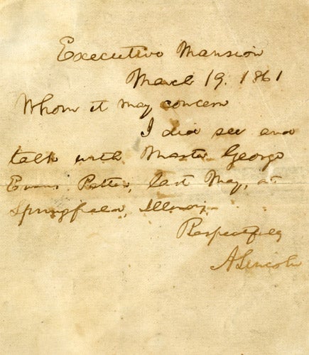 When George bragged of meeting the 16th President and commander-in-chief, however, his schoolmates would have none of it. So their class teacher wrote to Lincoln to explain the playground dispute and seek the truth. Lincoln wrote back confirming the event. His note reads simply: "Whom it may concern, I did see and talk with master George Evans Patten, last May, at Springfield, Illinois. Respectfully, A Lincoln."