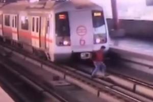 A boy walks on a pile of garbage covering a drain in New Delhi.