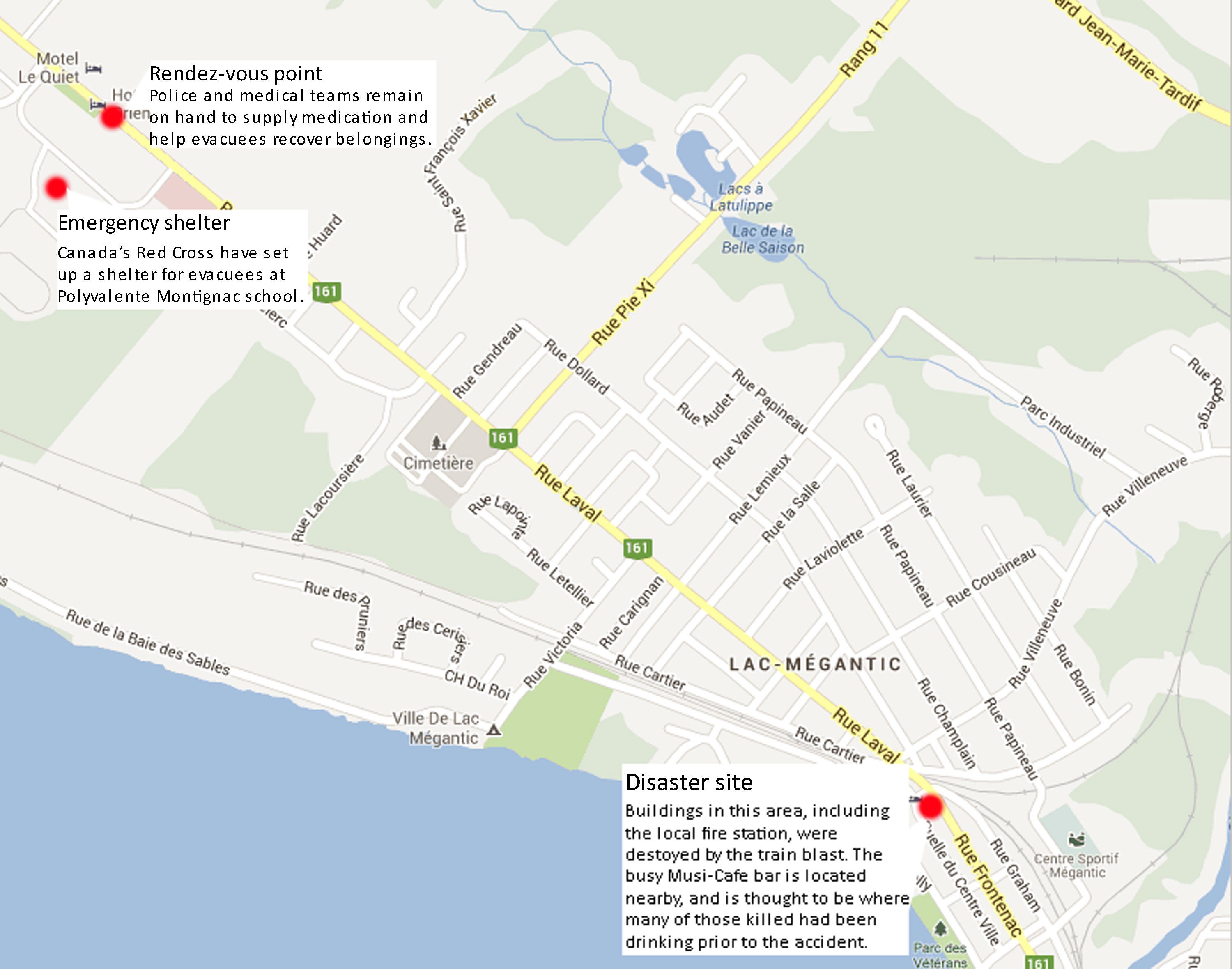 The eruptions sent residents of Lac-Megantic scrambling through the streets under the intense heat of towering fireballs and a red glow that illuminated the night sky. The district is a popular area packed with bars that often bustles on summer weekend nights. Police said the first explosion tore through the town shortly after 1am local time. Fire then spread to several homes.