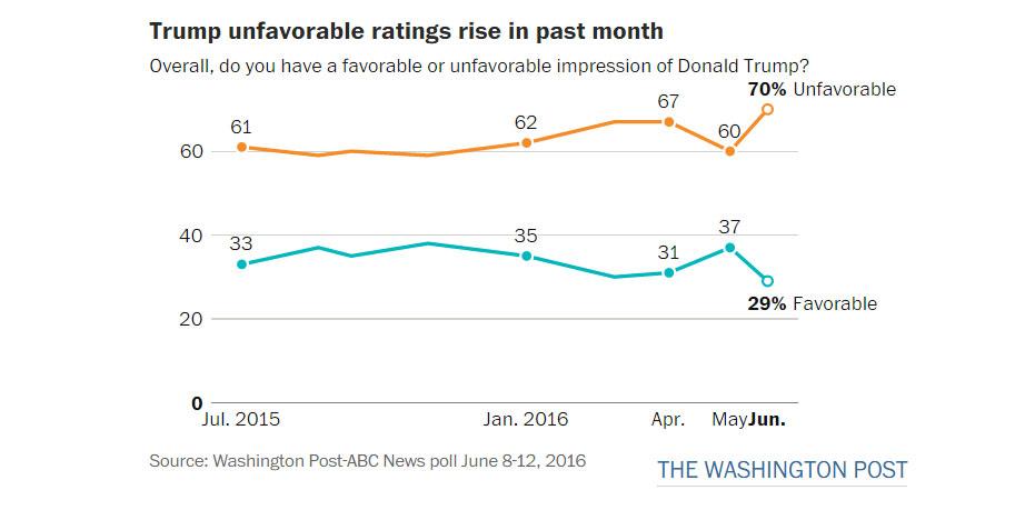 The poll finds 70 percent of Americans have an unfavorable view of Trump, including a 56 percent majority who feel this way "strongly." Negative ratings of Trump are up 10 percentage points from last month to their highest point since he announced his candidacy last summer, nearly reaching the level seen before his campaign began (71 percent). The survey was conducted Wednesday through Sunday among a random national sample of U.S. adults, coming after last week's primary contests, but with the large majority of interviews completed before Sunday's massacre at an Orlando club.
