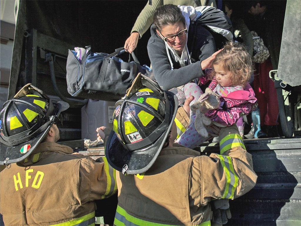 The fallout continued last night with swathes of lower Manhattan still stranded in the dark, and tens of thousands marooned across the Hudson River in Hoboken, New Jersey. The US National Guard was forced to move in to rescue and deliver meals to trapped residents after the city of some 50,000 people was overrun by floodwater as a result of the storm. At least 80 people have been killed in the US since the storm struck in the country's most densely populated region.