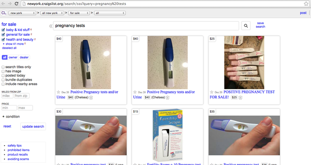 The Independent did a quick Craigslist search for pregnancy tests in New York, which yielded nine ads for positive pregnancy tests and urine ranging from $25-$40.