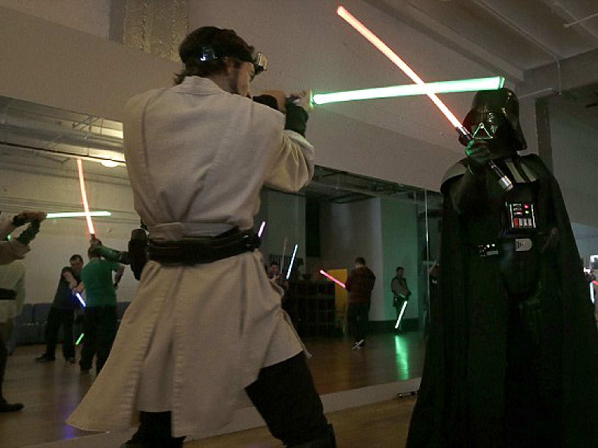 Accompanied by Star Wars music attendees slice and parry around the dance studio clutching neon-glowing lightsabers.