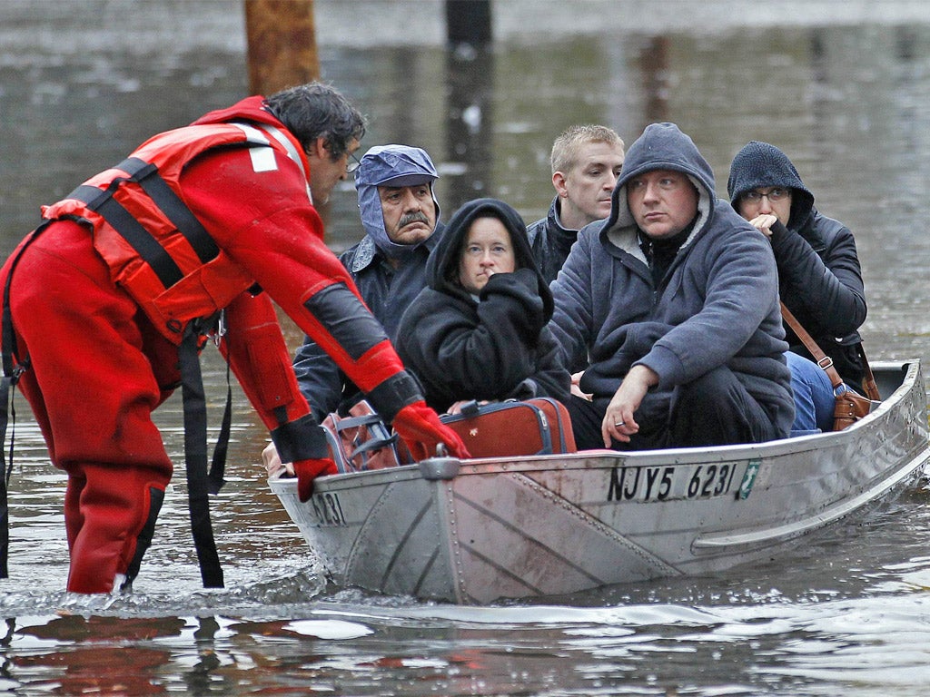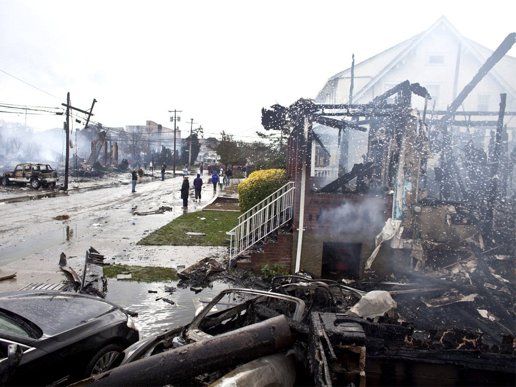 Half of Hoboken, on the Hudson's New Jersey shore, was flooded, following the record tidal surge of nearly 14ft into New York harbour. Sandy "came in and made Hoboken an island unto itself, the Hudson flooded us like a bathtub," Dawn Zimmer, Hoboken's mayor, told CNN. New York experienced its own tragedies and dramas. At least 80 houses burned down in Queens as fire, probably caused by an electrical short-circuit, consumed the largely wooden buildings.