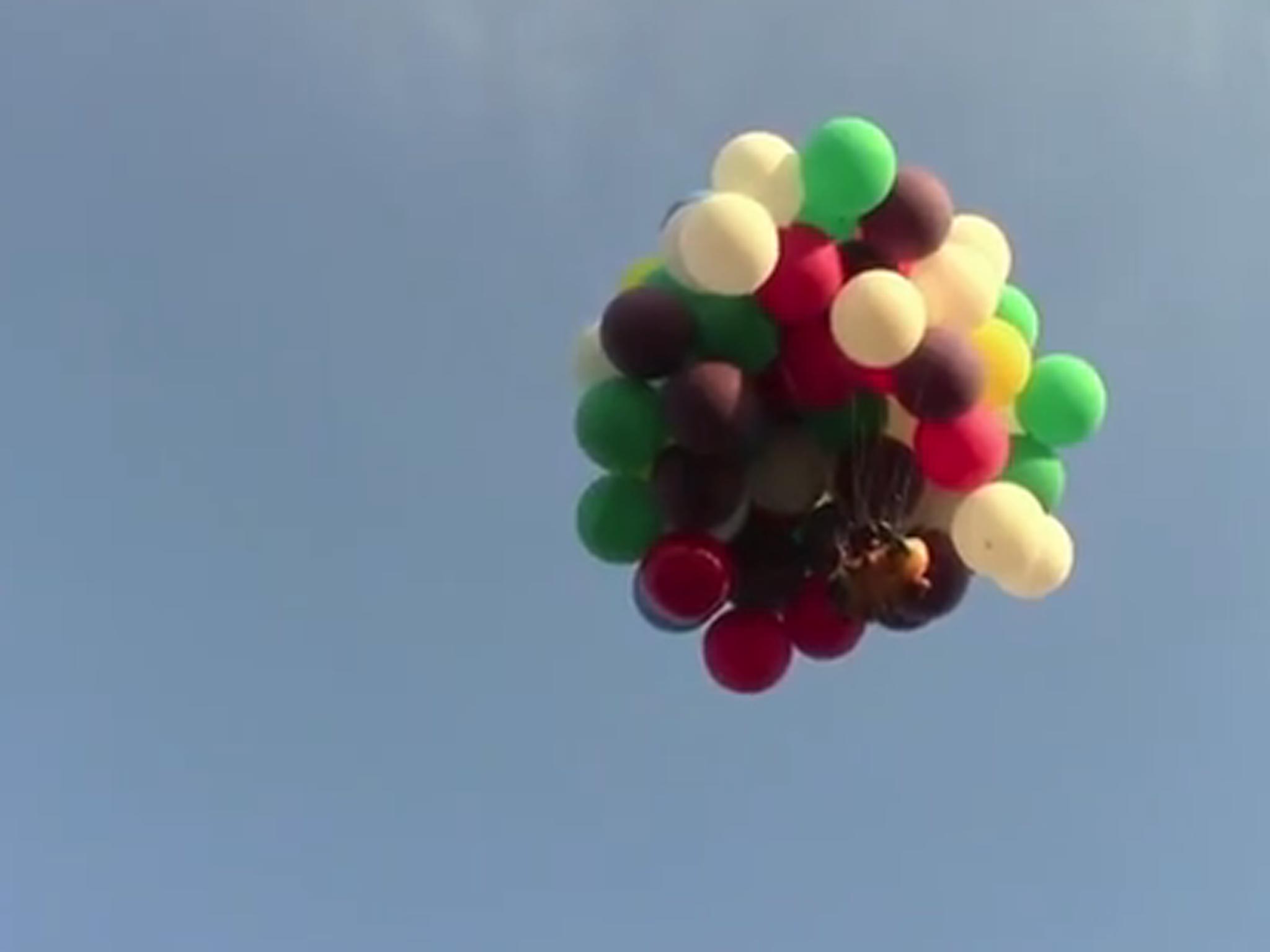 In scenes reminiscent of Disney film Up, Jonathon Trappe took off in Caribou, Maine on Thursday amid heavy fog whilst in a lifeboat attached to 370 helium filled balloons.