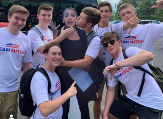 The group – wearing campaign T-shirts backing Senate majority leader Mitch McConnell – are seen laughing as they claw at the Democrat congresswoman’s life-size image.
