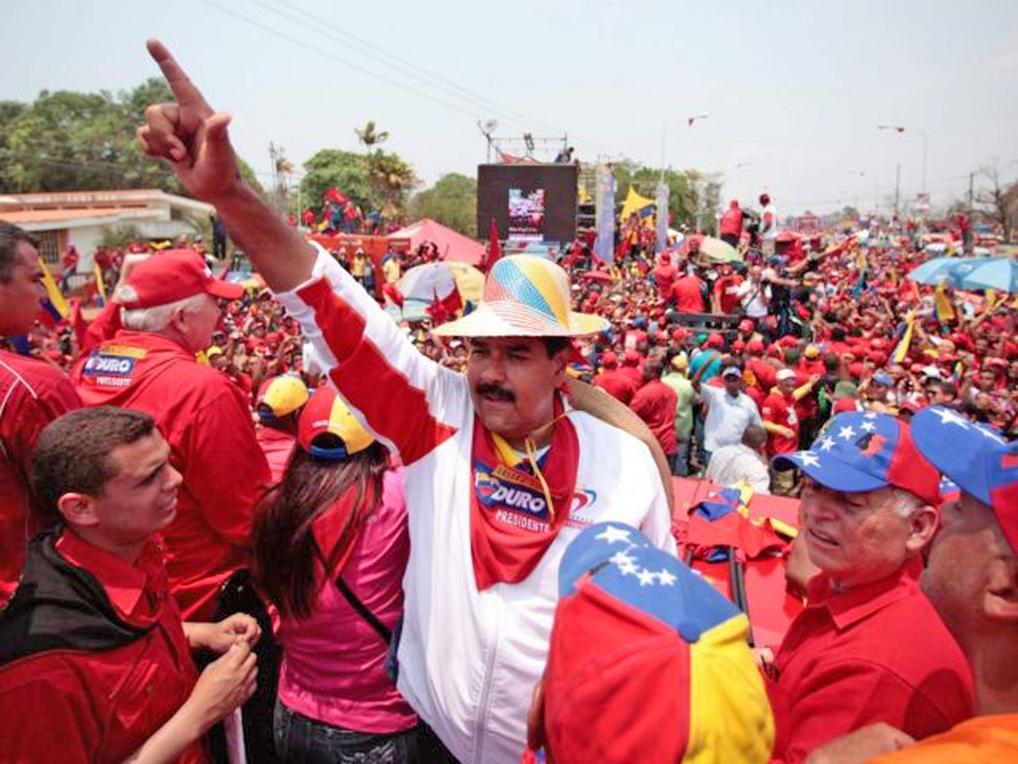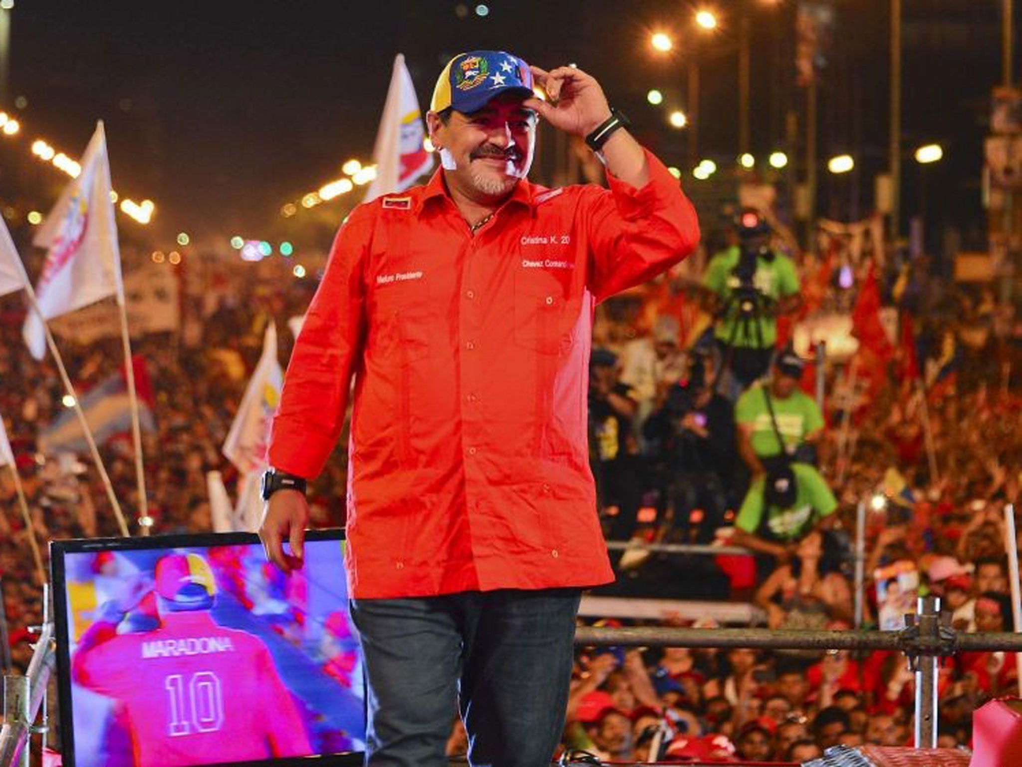 While Capriles addressed a large crowd in the north-western city of Acarigua, in the capital, Caracas, Maduro was joined onstage yesterday – the last day of campaigning – in front of hundreds of thousands of supporters by the Argentinian former football star Diego Maradona, and by Chavez’s brother, Adan.