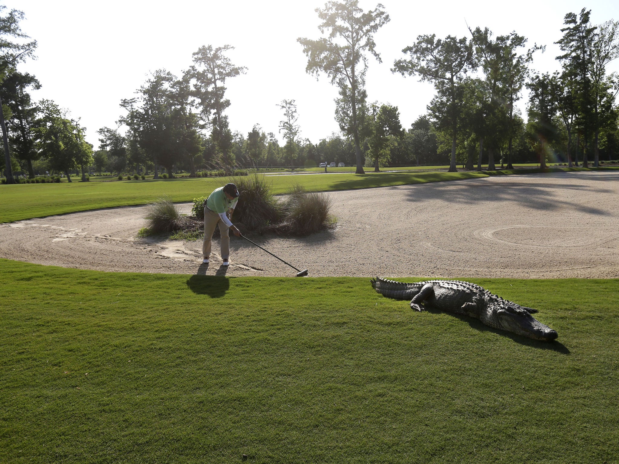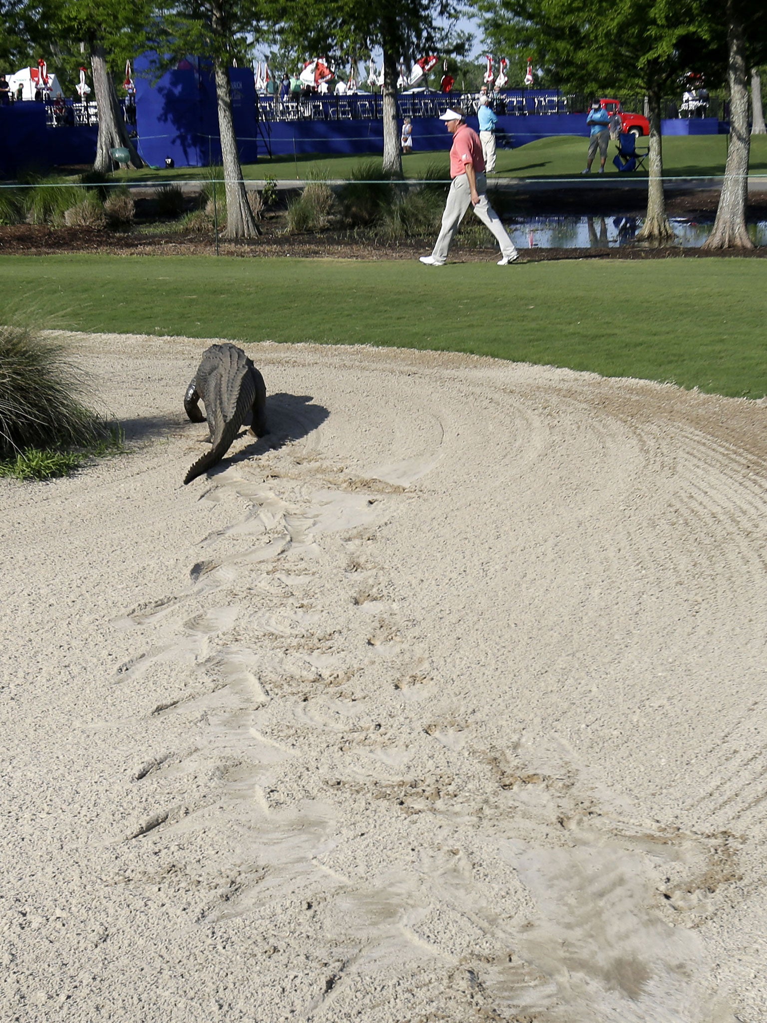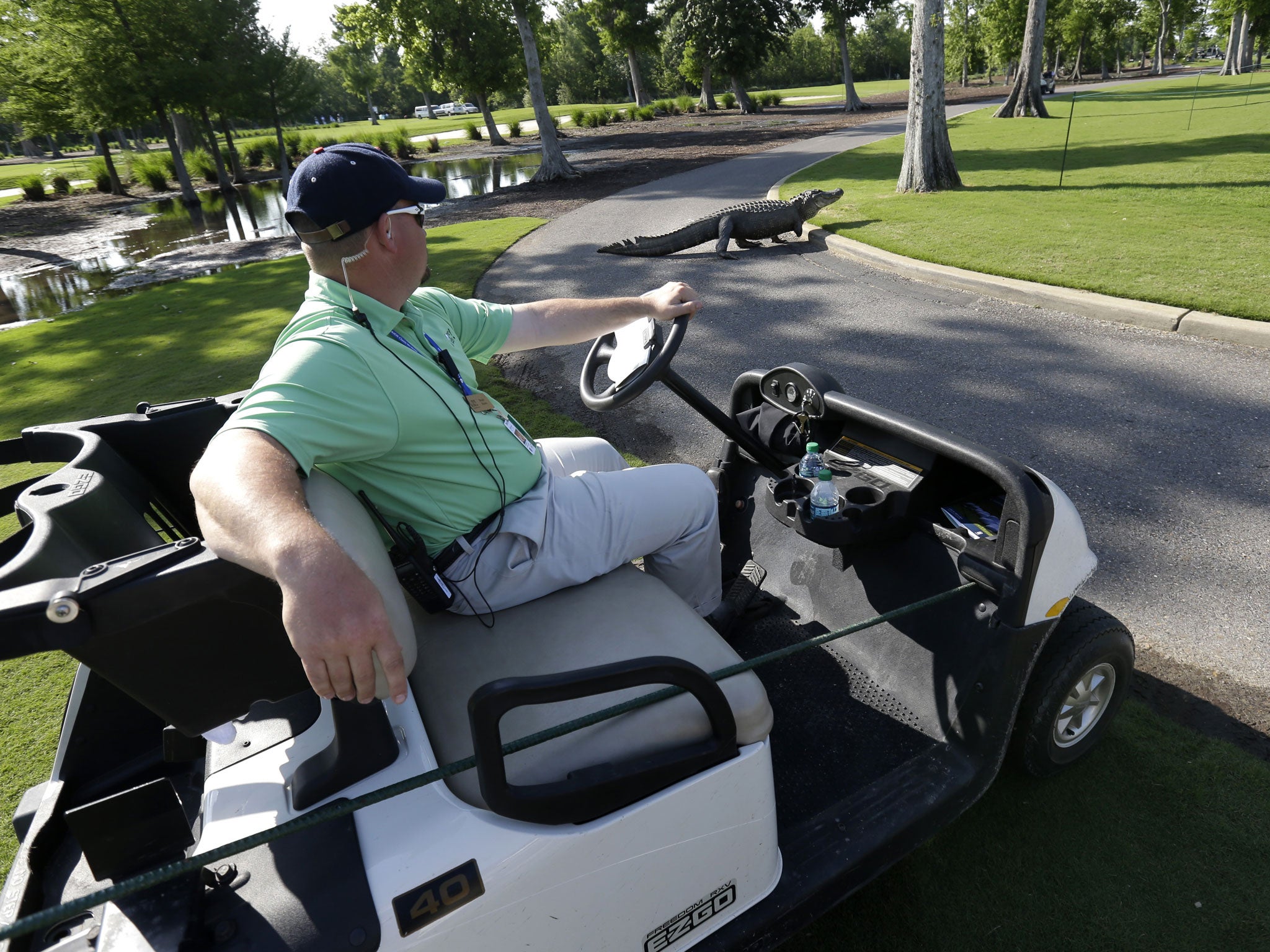 In the video, uploaded by PGA Tour, the organiser of the main men's professional golf tours, one of the commentators can be heard saying: "This is to get the guys to play a little bit faster; just put an alligator behind them."