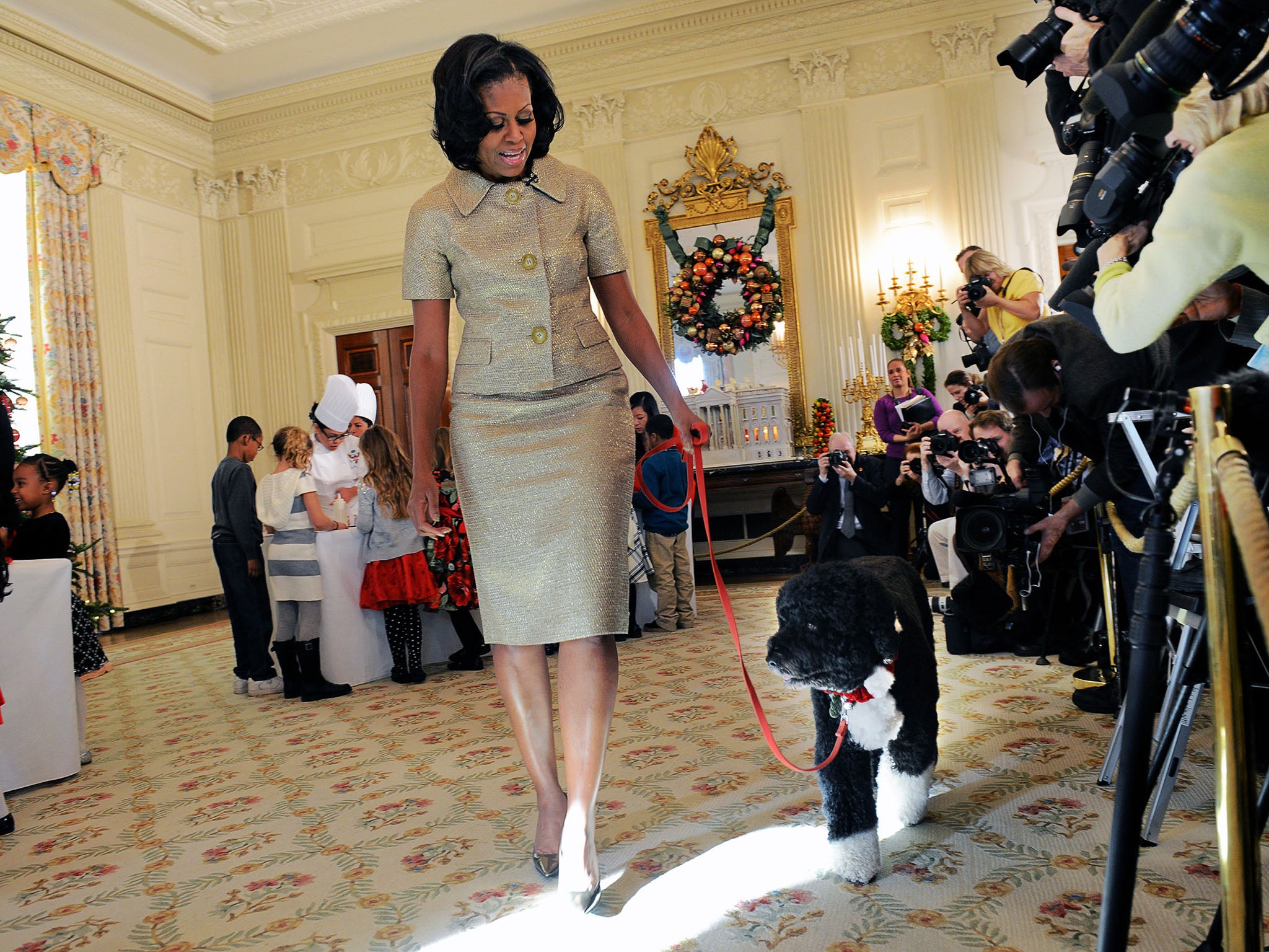 First lady Jacqueline Kennedy is credited with selecting the first White House holiday theme and starting 50 years of presidential traditions of ribbons and bows, lamb chops and eggnog. And don't forget all those White House pets that are honored at the holidays, including Laura Bush's Scottish terrier, Barney, who starred in his own series of "Barney Cam" holiday videos, and the Obamas' Portuguese water dog Bo, who has been depicted made out of pipe cleaners and had holiday cookies made in his likeness. New for 2012: "Boflakes," large round snowflakes featuring the popular pet. Visiting children will be given bookmarks with a checklist of eight rooms with hidden Boflakes and challenged to find them all.