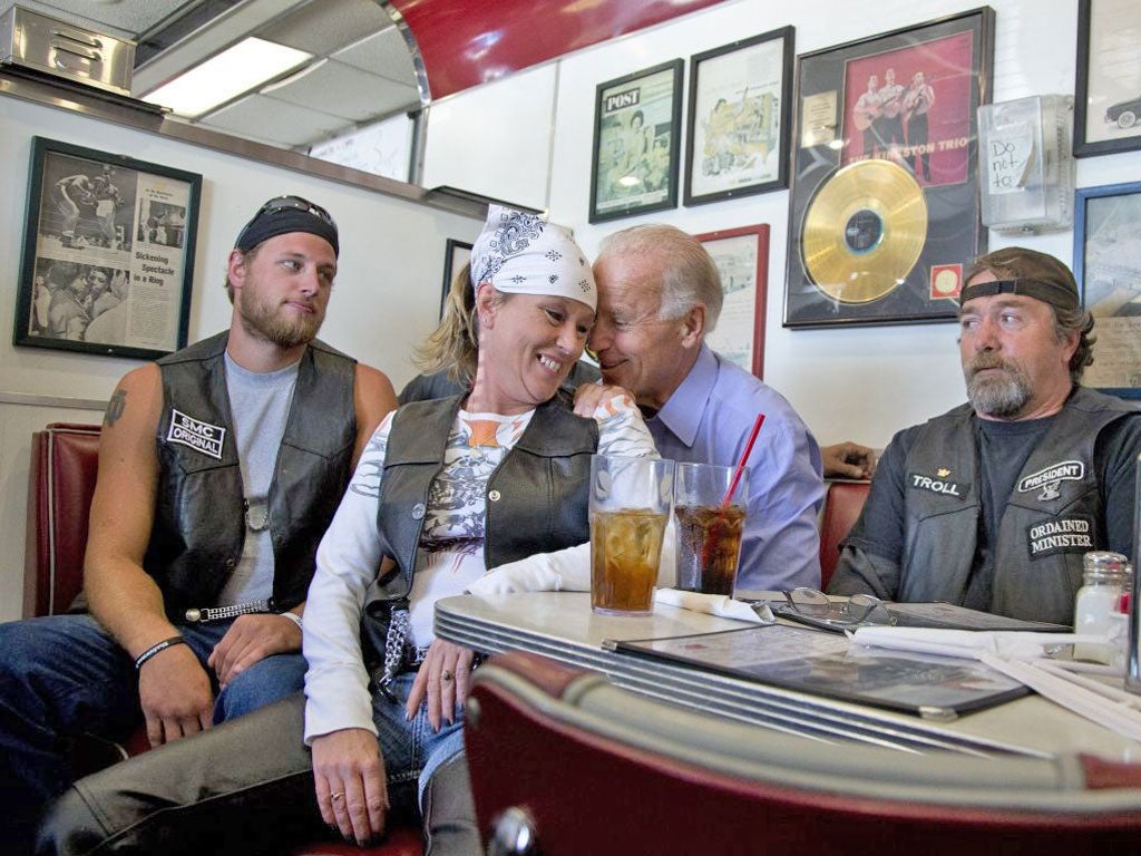 Meanwhile, 842 miles away at the jauntily named Cruisers Diner in Seaman, Ohio, Vice-President Joe Biden was giving a shoulder rub to a female member of a local biker gang known as the Shadowmen MC.