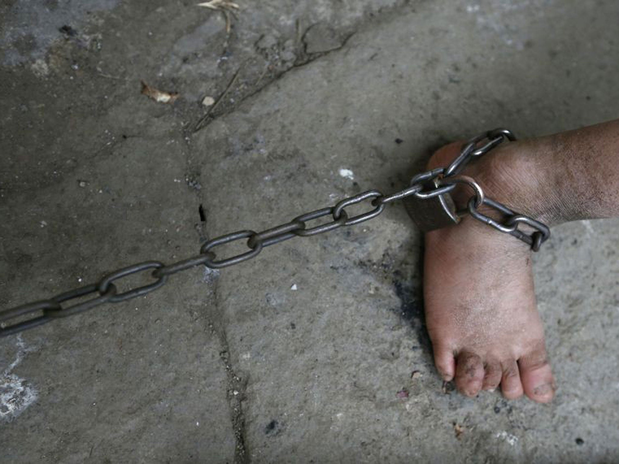 He has been seen walking along his village shackled to his father in the eastern coastal province of Zhejiang. He has also been seen chained to a pillar as his home.