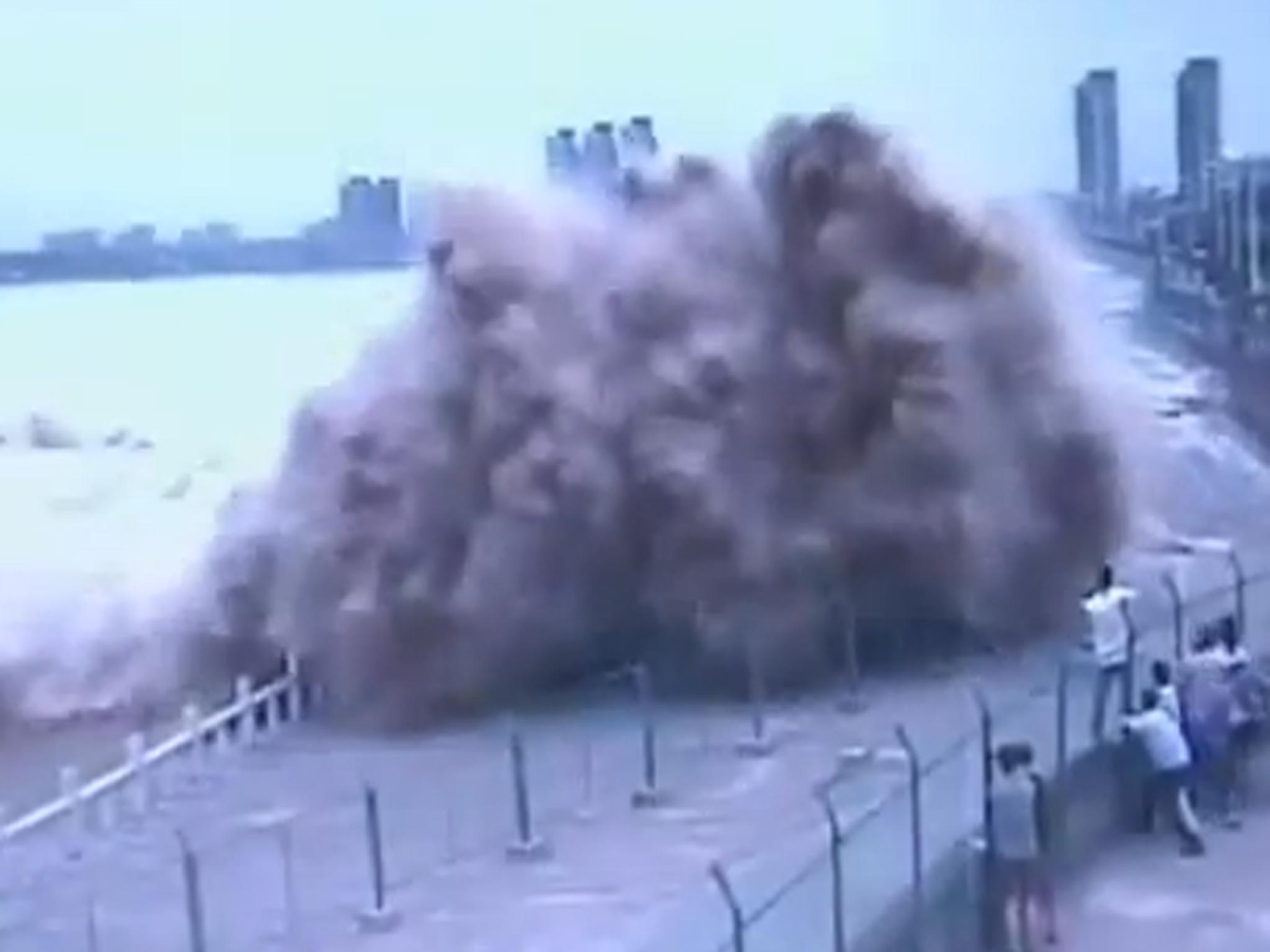 The tidal bore, which had been made more powerful by Typhoon Trami, destroyed part of a protection wall and net along the Qiantang River near the city of Hainin in eastern Zhejiang Province.