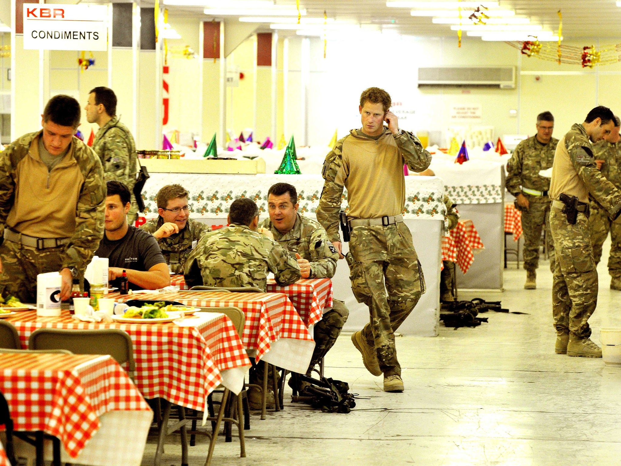 The prince is followed having dinner in army fatigues with his fellow fighters in the Camp Bastian cookhouse. Queuing up with squaddies to pile up "scoff" on his paper plate, he sits on a collapsible chair to eat a hearty meal of chicken, broccoli and cheesy potatoes with plastic cutlery. Away from the temptations of Vegas – Camp Bastion is an alcohol-free zone – the prince drinks water with his meal. It's all a long way from a life of nightclub indulgence and palace privilege.