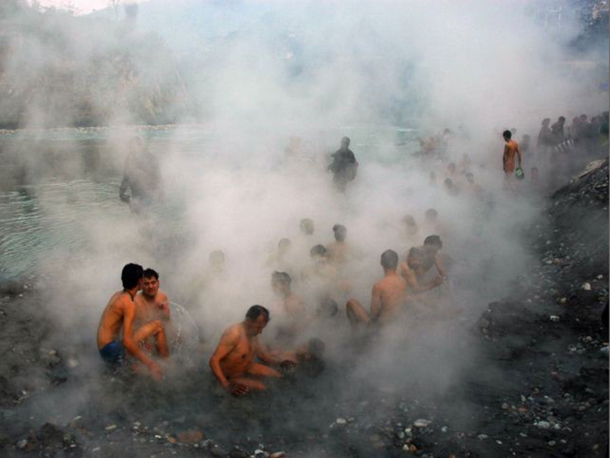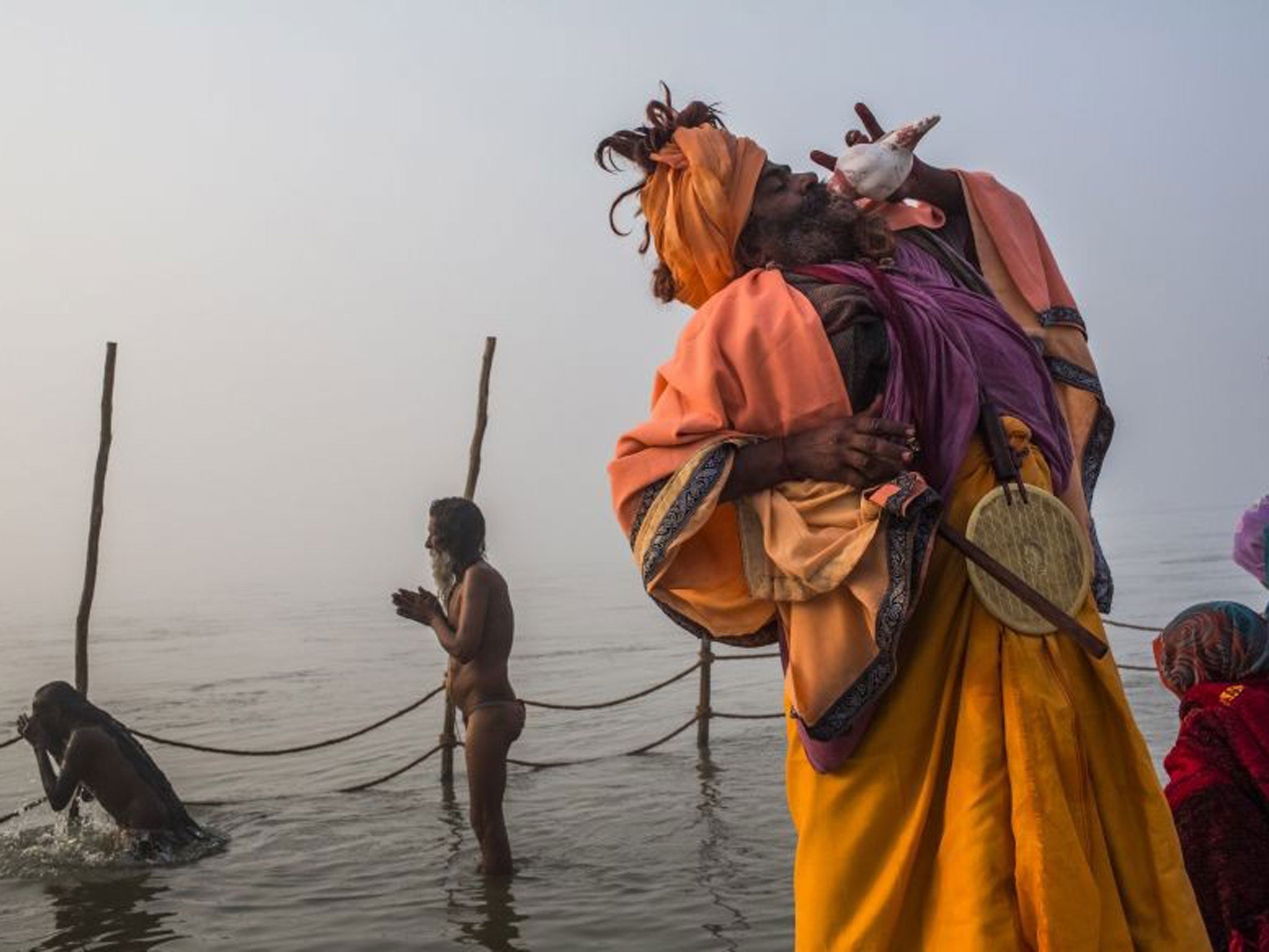 The pilgrims gather to bathe in the water which, according to Indian Hindu belief, washes away sins.