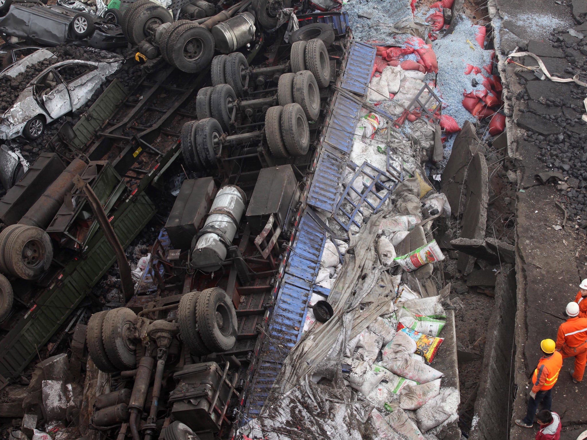 A lorry carrying fireworks before the Chinese New Year celebrations exploded on a highway bridge today, killing at least 26 people as it sent vehicles plummeting to the ground.