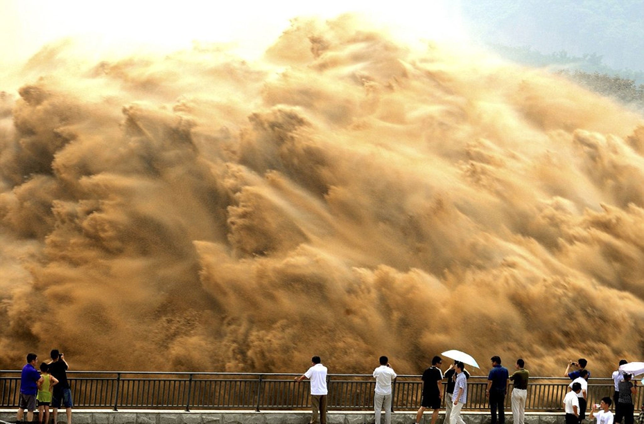 In fact, the large-scale silt-shifting operation has become something of a tourist attraction, drawing large crowds who, umbrellas aloft, watch the waves crash through purpose-built holes in the huge dam.