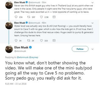 He then added: “You know what, don’t bother showing the video. We will make one of the mini-sub/pod going all the way to Cave 5 no problemo. Sorry pedo guy, you really did ask for it.”
